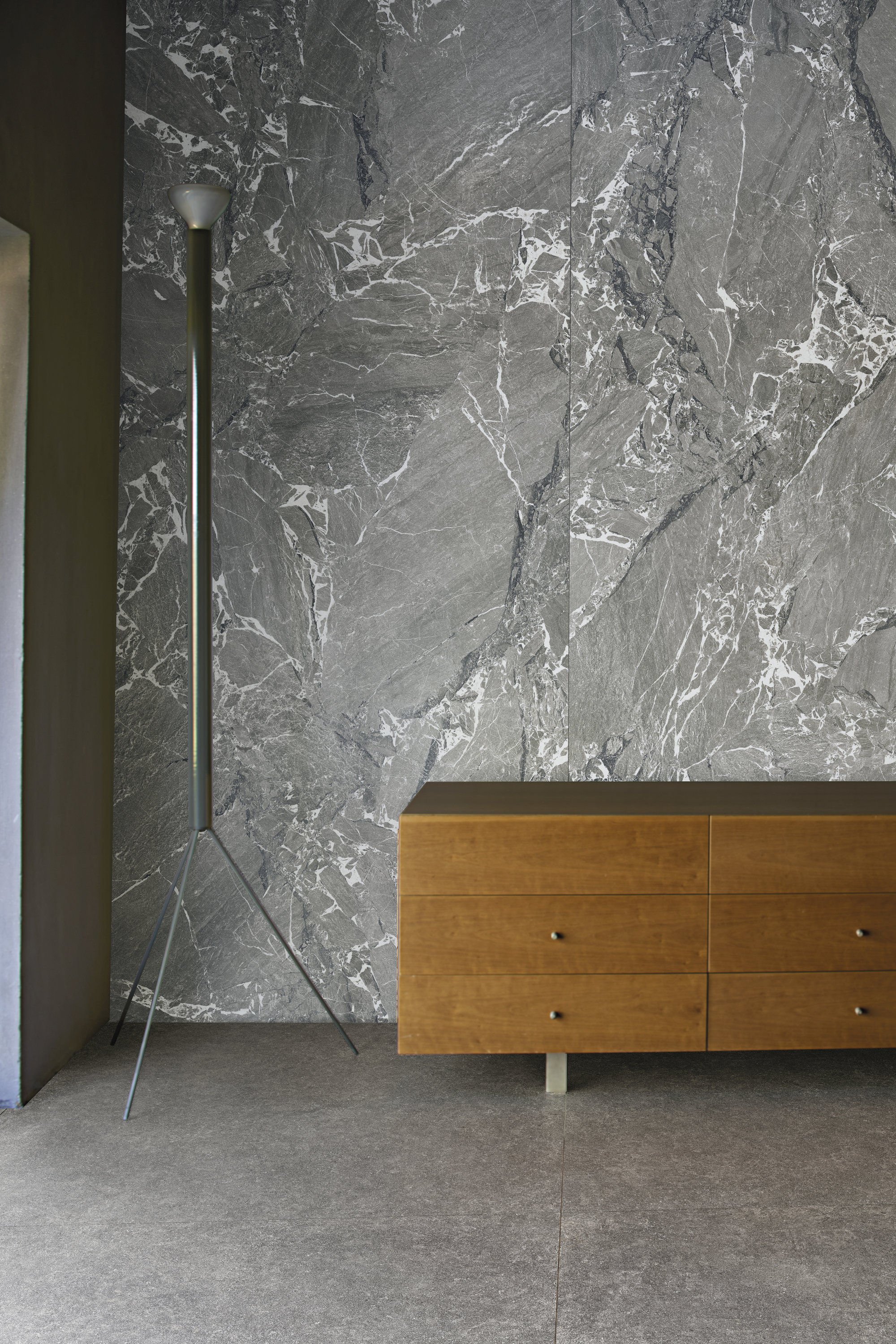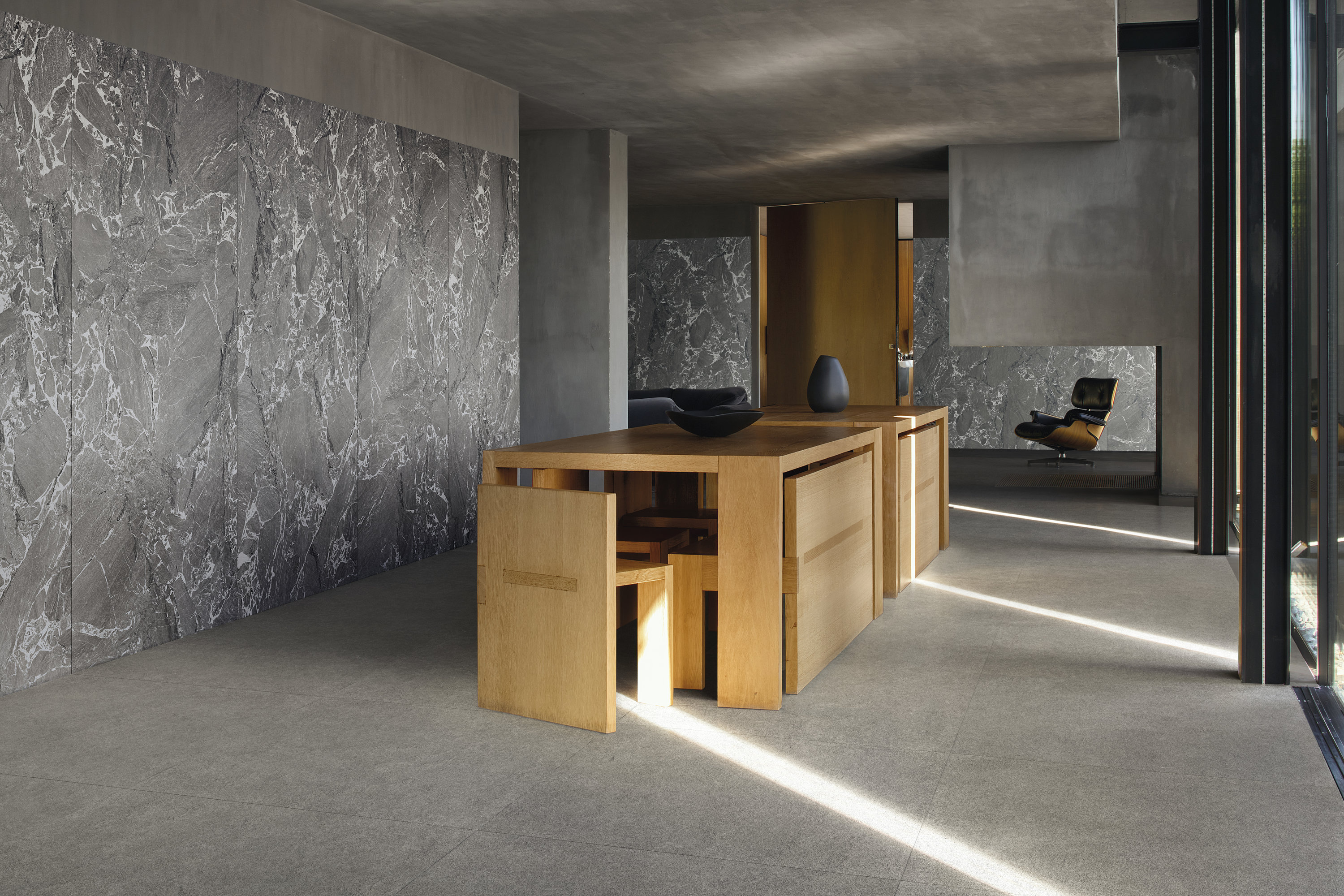 Superficie que relee la tradición de los mármoles arabescos con una trama intensa, marcada por vetas oscuras que se mueven sobre un fondo gris claro. El efecto es dinámico y vibrante, capaz de aportar ritmo a los espacios sin perder el equilibrio. Disponible en formatos cerámicos de 8 mm y en losas Maximum de 270×120 cm, en los acabados Natural y Natural Plus, Arabescato Grigio encuentra su fuerza en la capacidad de unir clasicismo y contemporaneidad, convirtiéndose en una base ideal para quienes desean transmitir elegancia y movimiento. Esta superficie en formato Maximum se produce con tecnología a base de agua: excelente resultado estético, alta definición de la imagen y efecto matérico, bajo el signo de la sostenibilidad medioambiental.