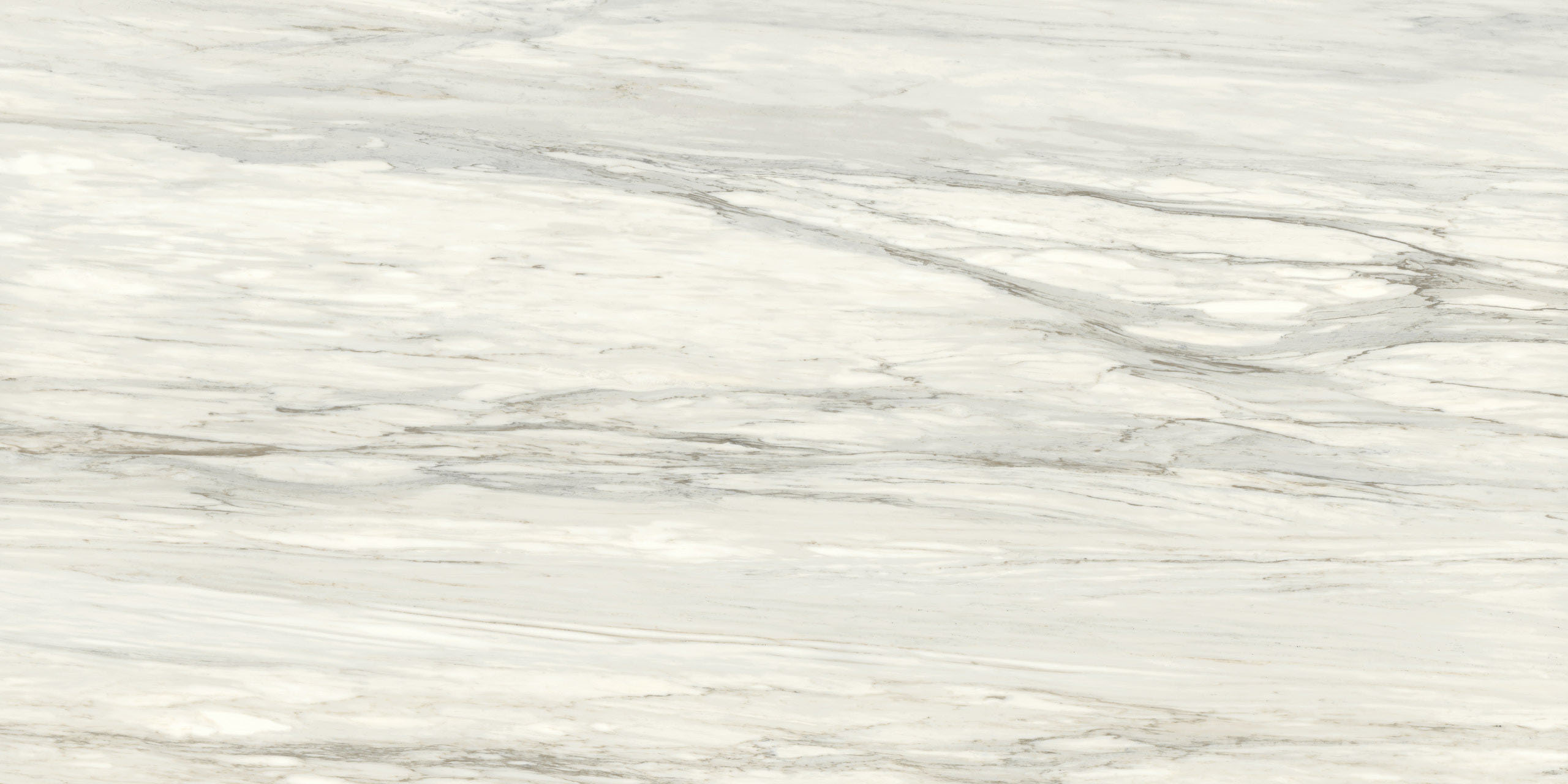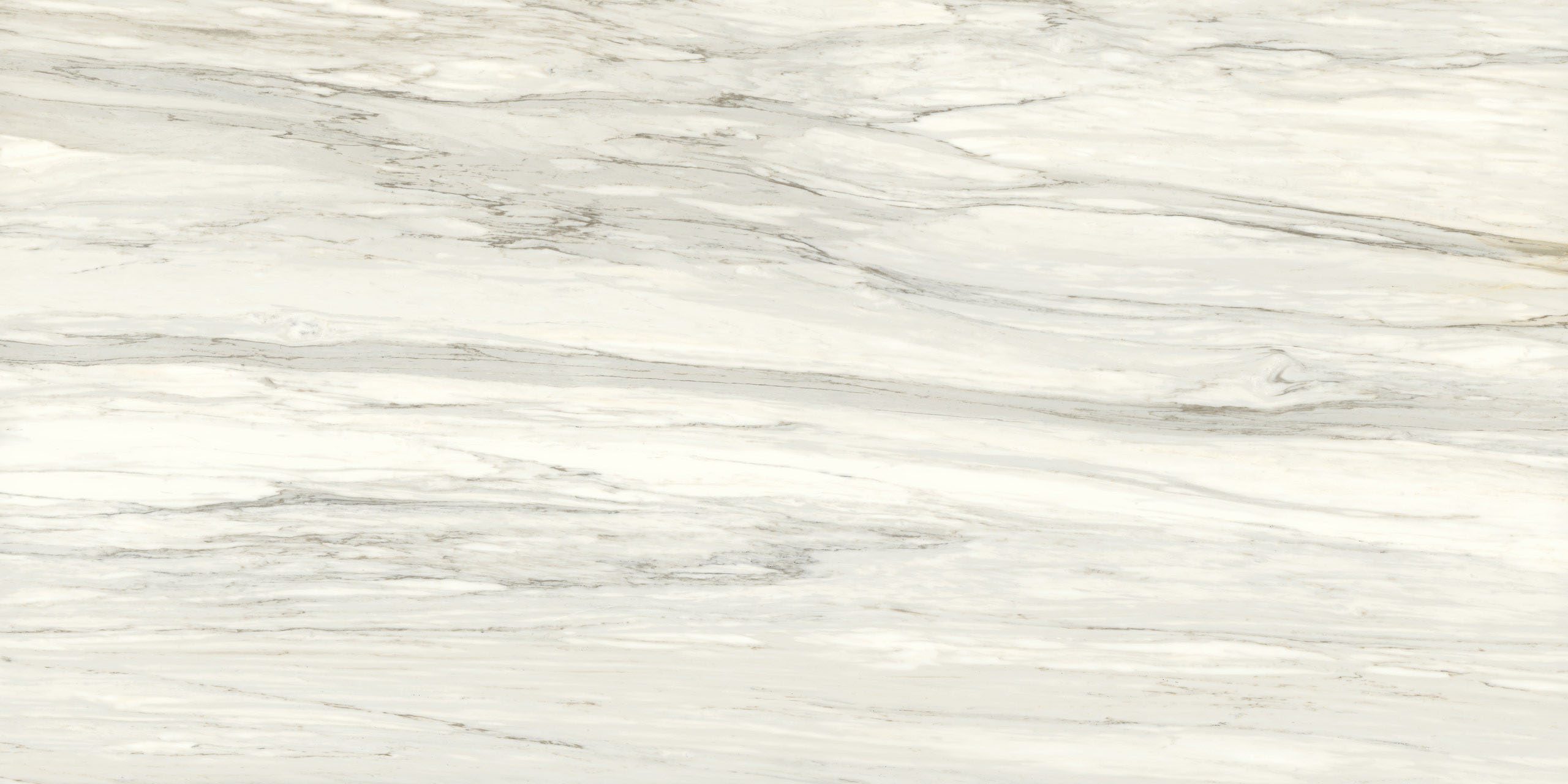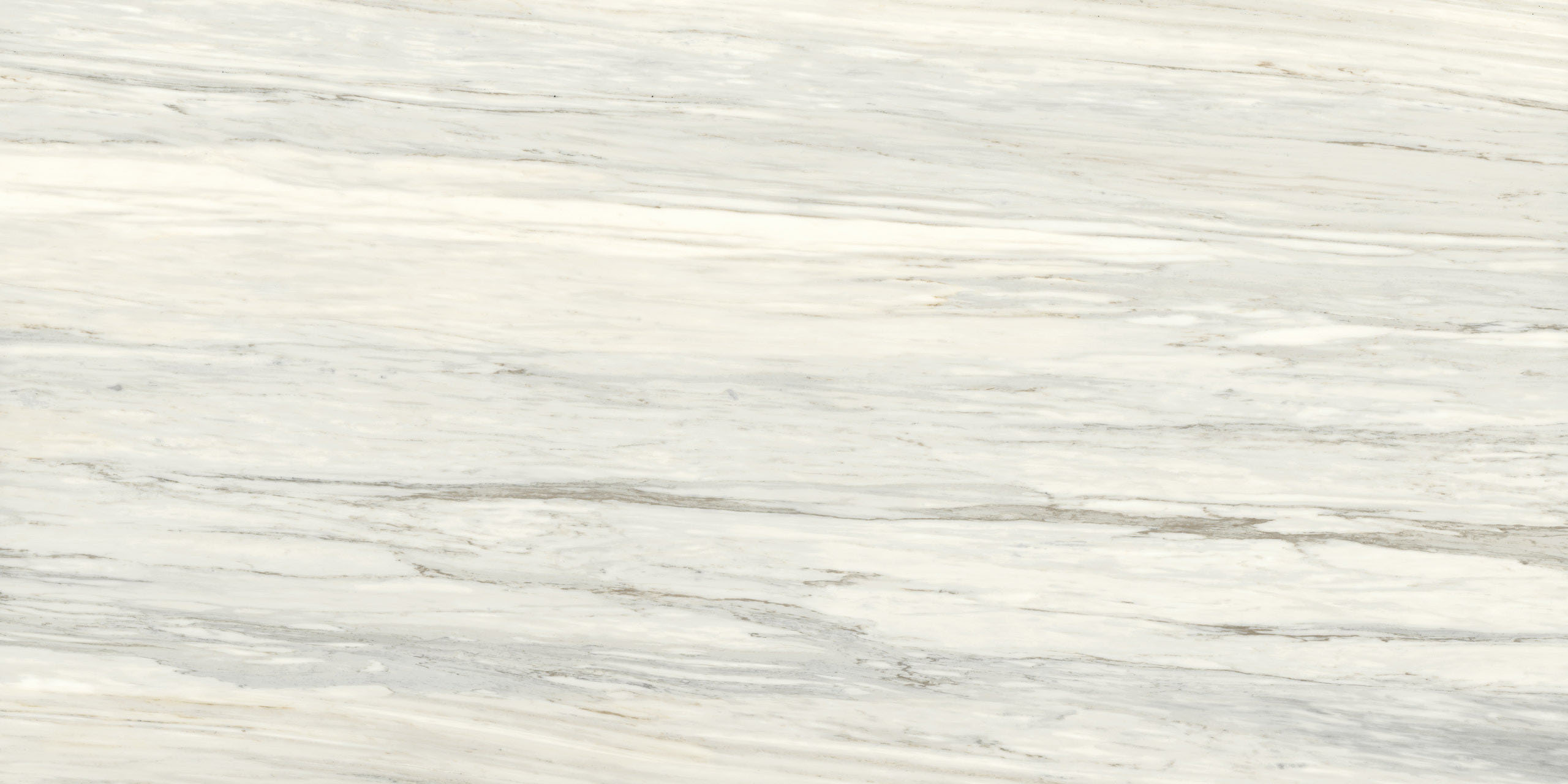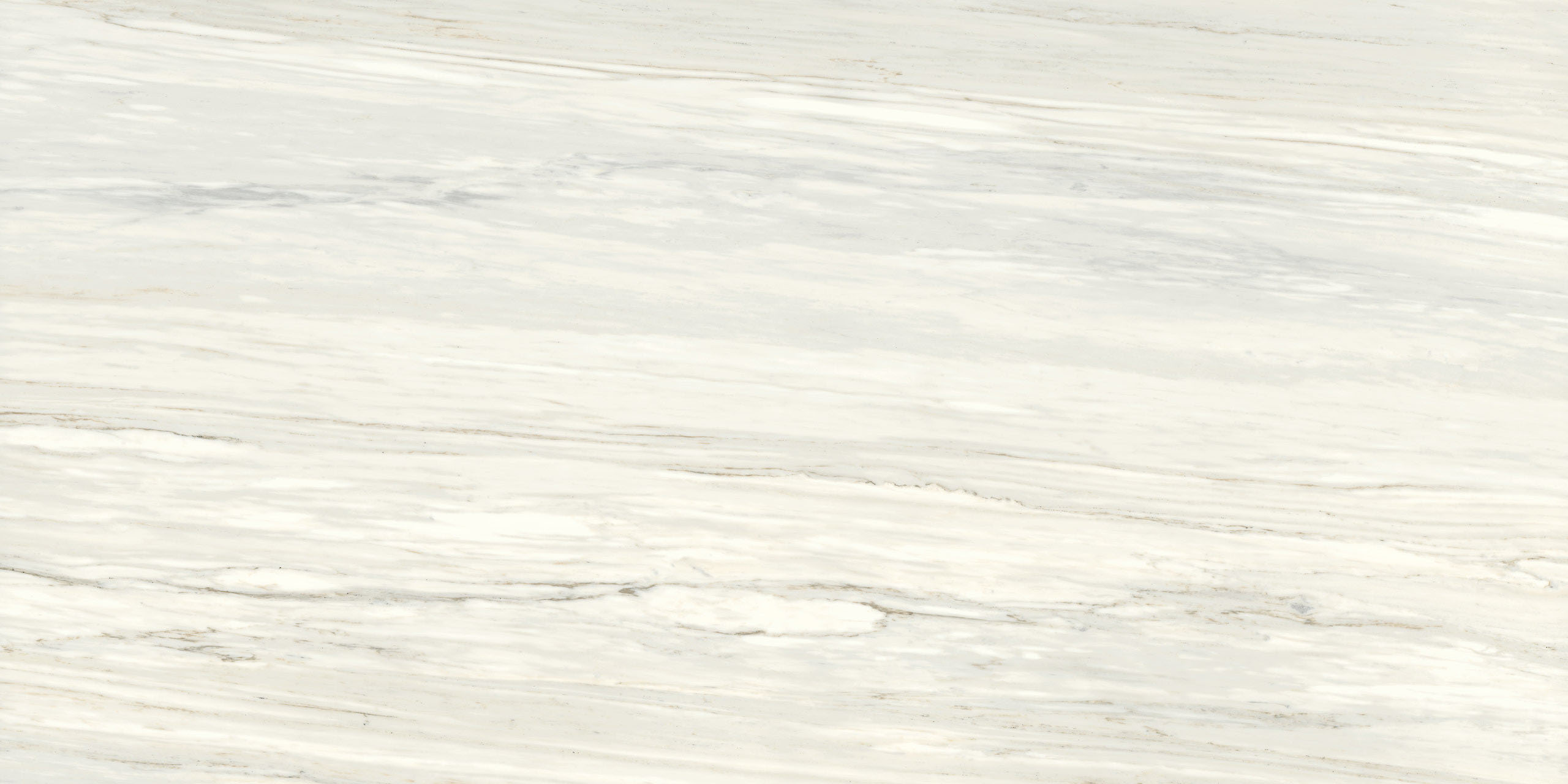 El fondo luce un matiz preciso de marfil, sólido pero muy delicado, atravesado en longitud por una cascada evanescente de bandas y estrías: alineadas y dispuestas en una trama en la que pigmentos minerales se concentran y luego se espacian, esbozando así espesas vetas de color gris perlado o trazos beige intenso.