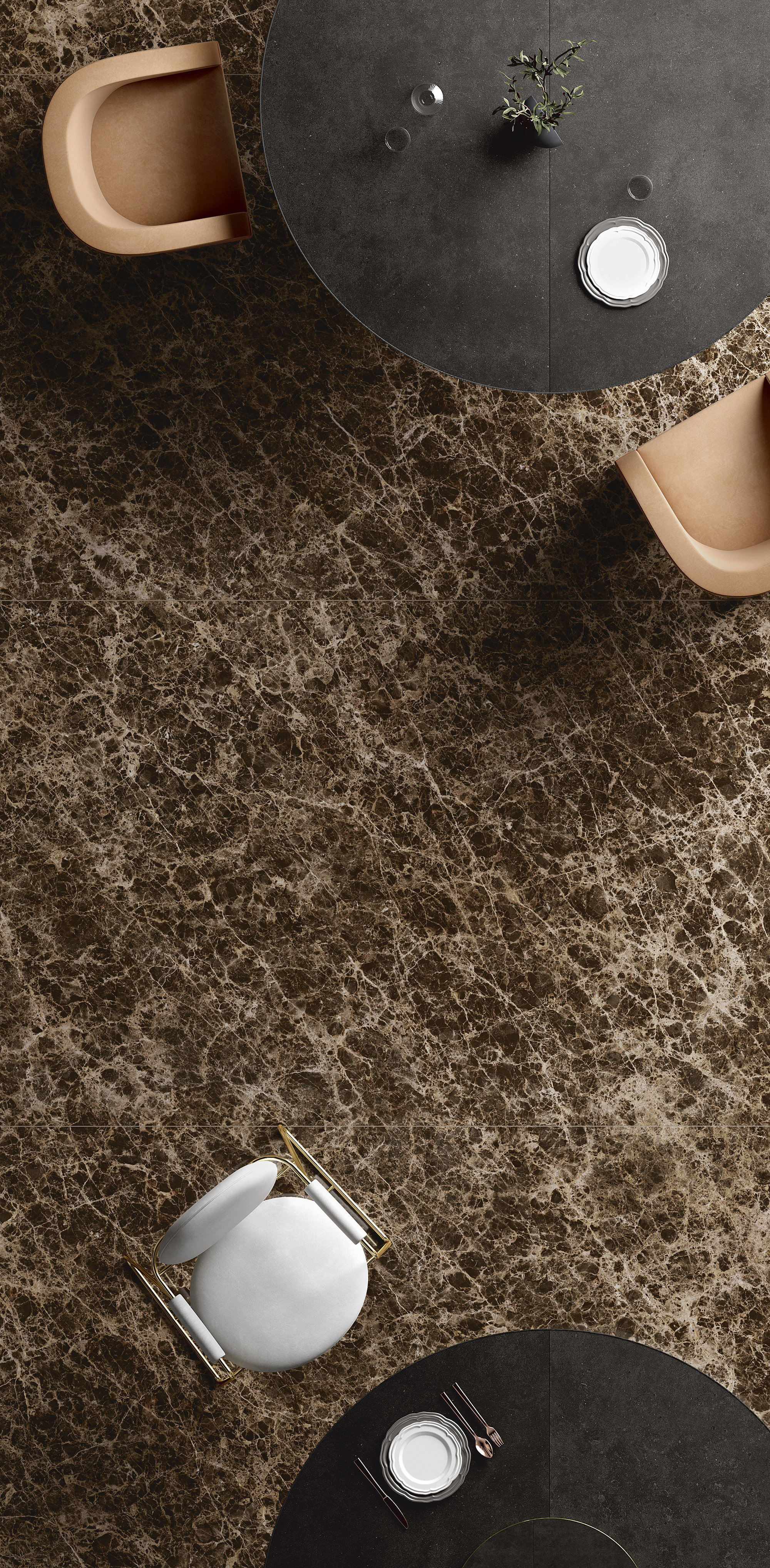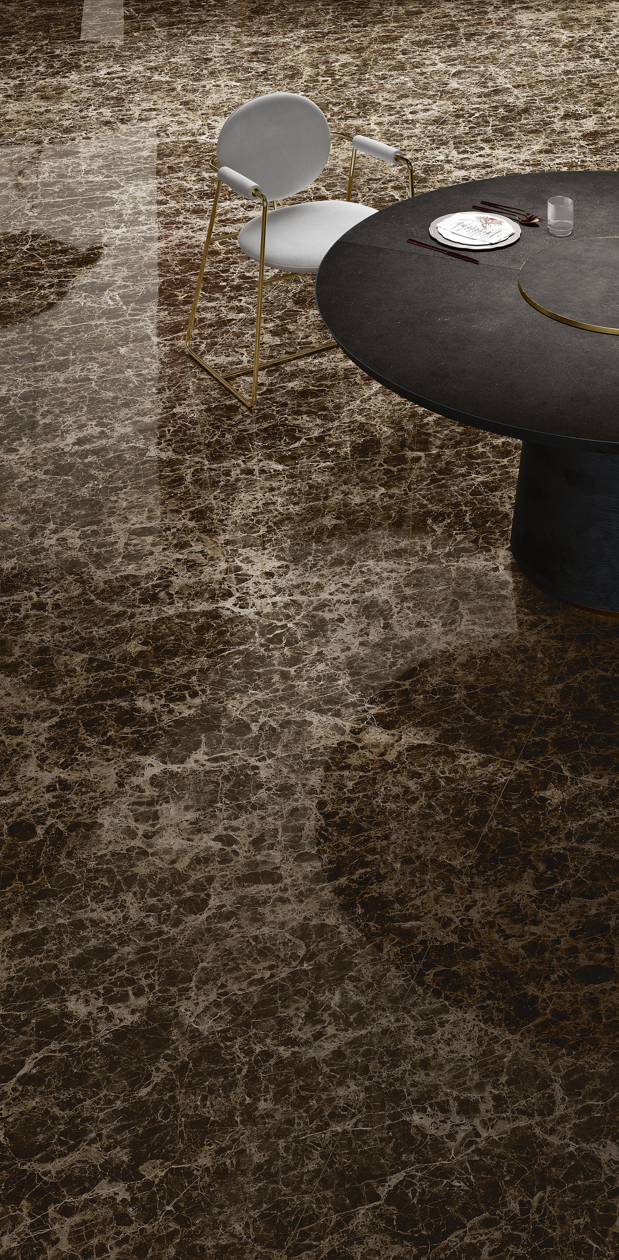 Deep Emperador se caracteriza por un precioso color marrón oscuro, casi negro, con vetas cálidas en tonos avellana, crema y caramelo. Sus matices dorados y reflejos iridiscentes hacen que los espacios sean elegantes y exclusivos. Deep Emperador es ideal para suelos y revestimientos interiores, fachadas exteriores y mobiliario decorativo refinado y contemporáneo.