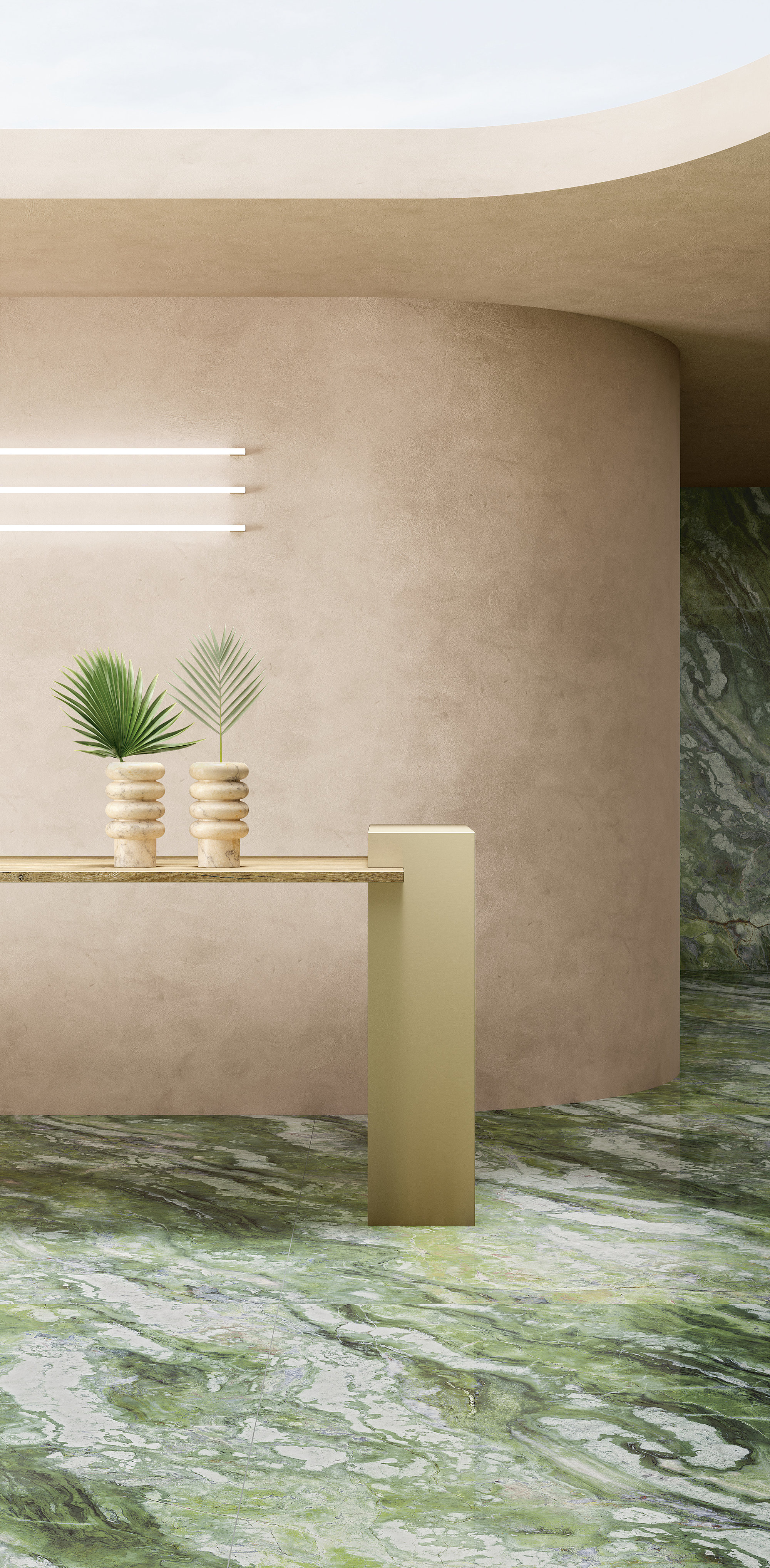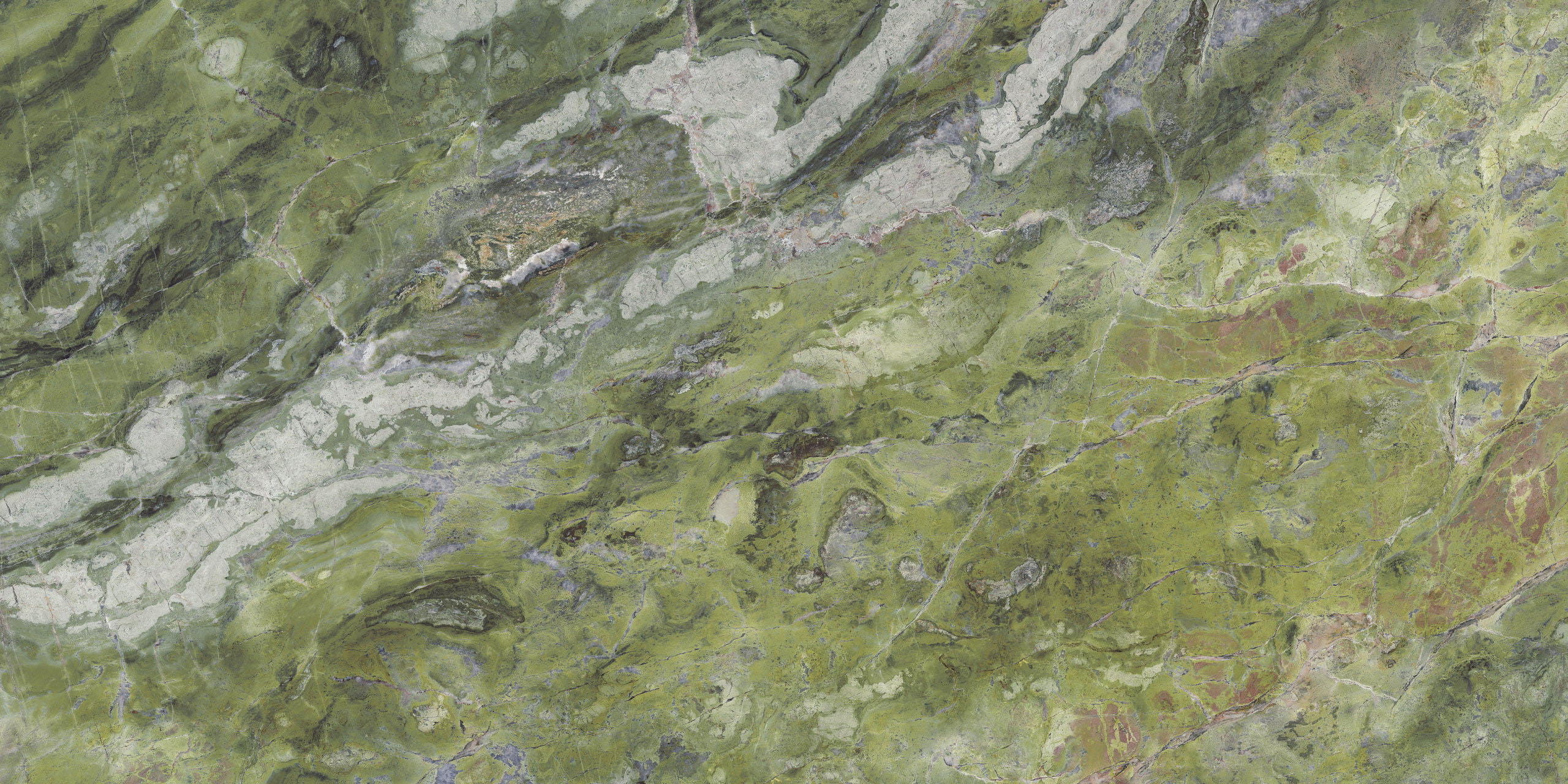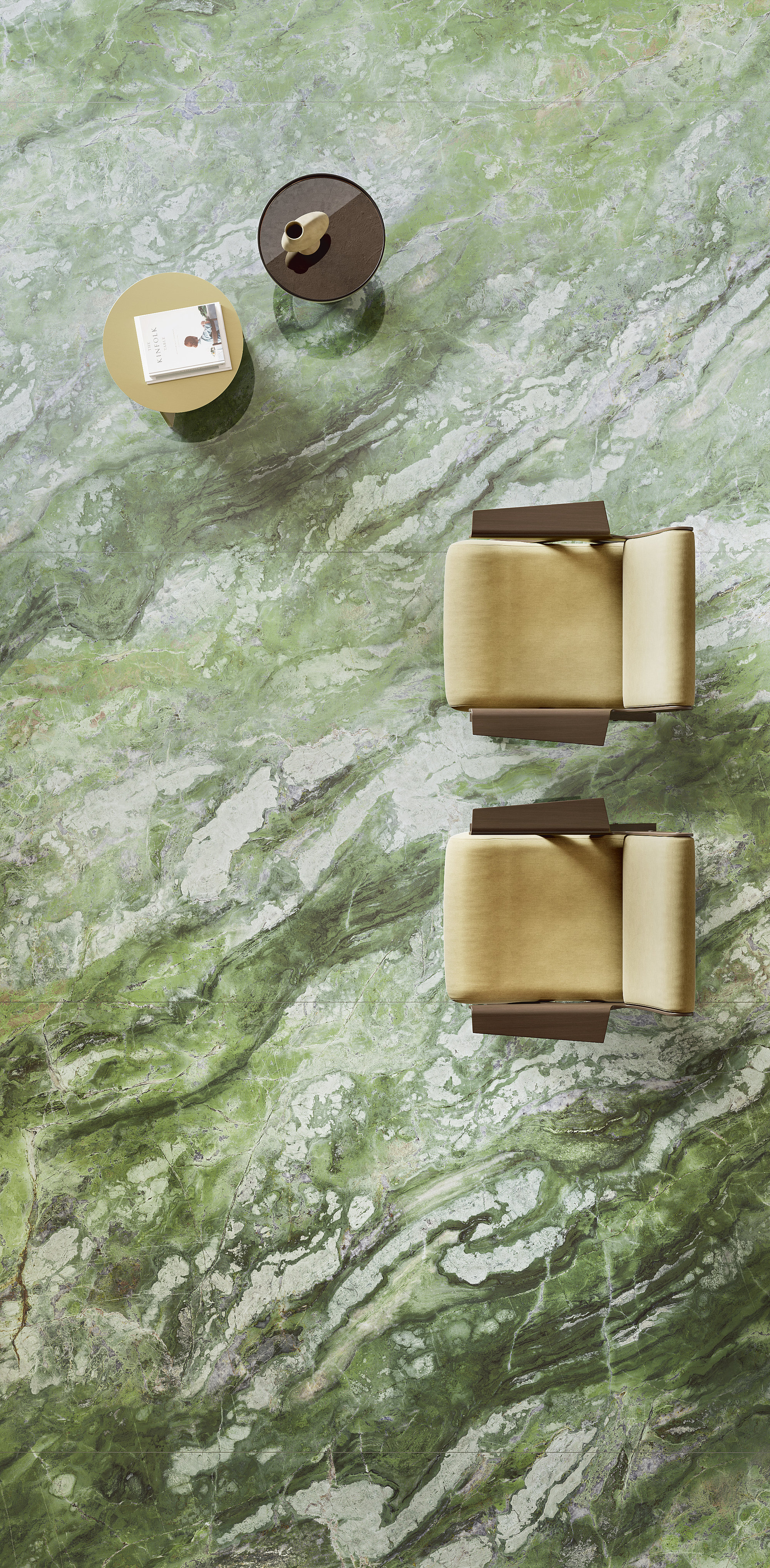 Sobre un fondo verde intenso, ligeramente ácido, se insertan matices crema, sepia, marrón y gris, interrumpidos por vetas que recuerdan a la calcita cristalina. El fondo no es uniforme y se presenta en varias tonalidades de verde, desde claro hasta oscuro, realzadas por el acabado Polished. Irish Green Maximum se inspira en un mármol bastante raro y antiguo, con innumerables matices de verde. La particularidad del diseño y el espesor de 6 mm lo hacen ideal para diversas aplicaciones tanto interiores como exteriores, como pavimentos o revestimientos, así como para mobiliario.