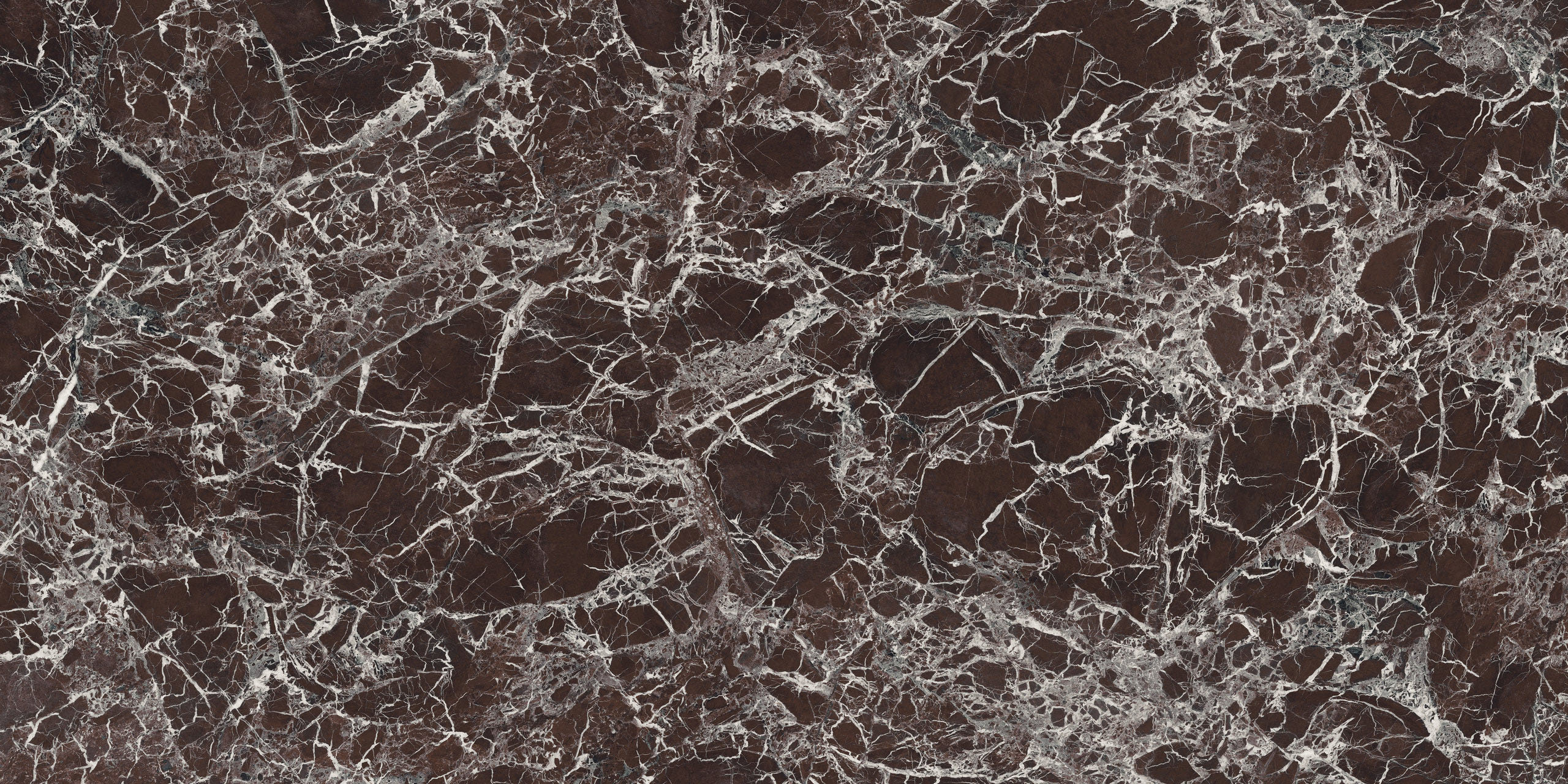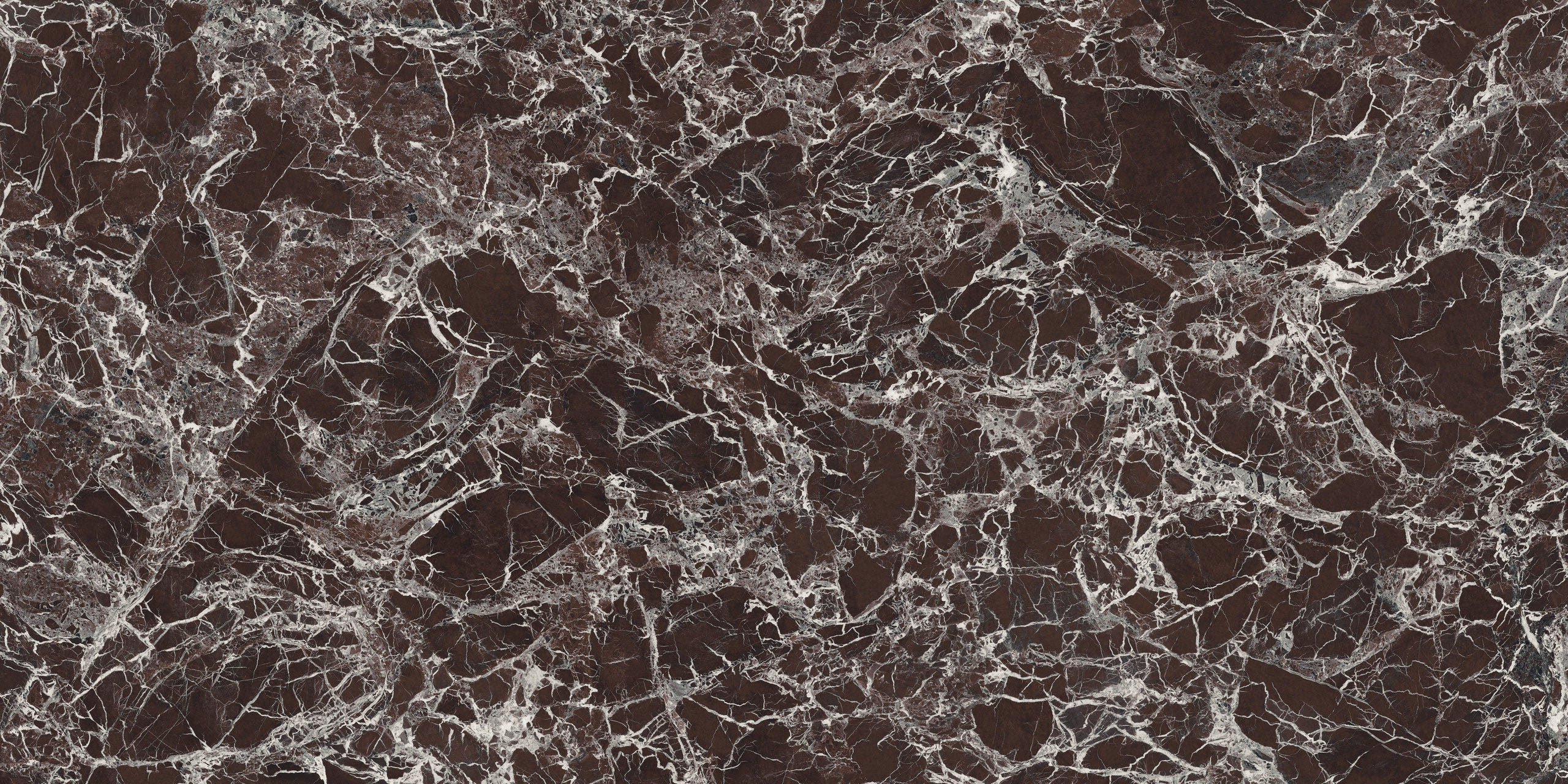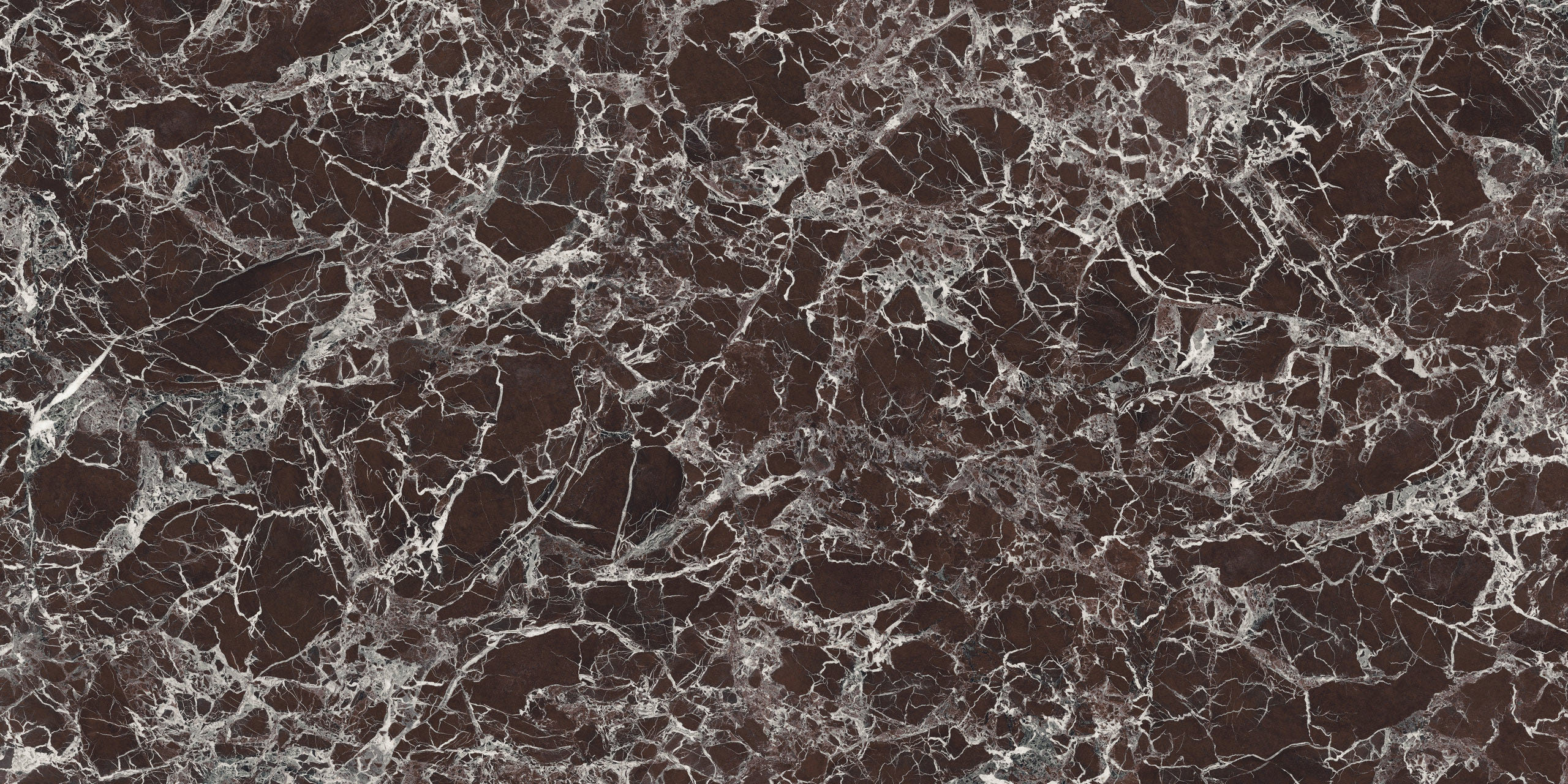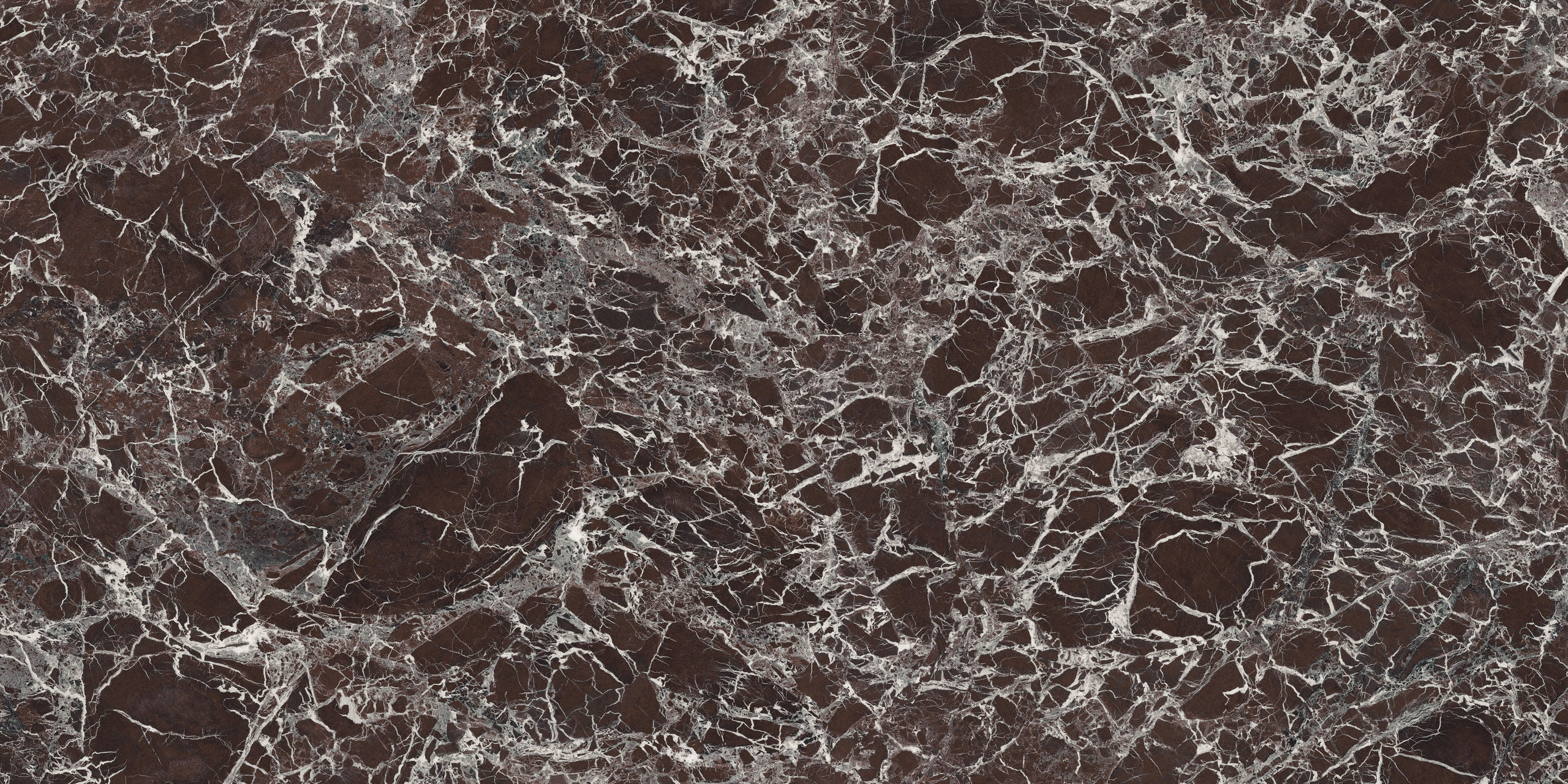 El dibujo brechiforme se vuelve majestuoso, imperial: extiende un tupidísimo entramado de vetas lechosas sobre el manto teñido de púrpura y burdeos, a veces interrumpido por intrusiones oscuras, más frías. La obra mineral, en su rigor e imprevisibilidad, hace gala de una identidad estética uniforme y, al mismo tiempo, infinitamente variable.