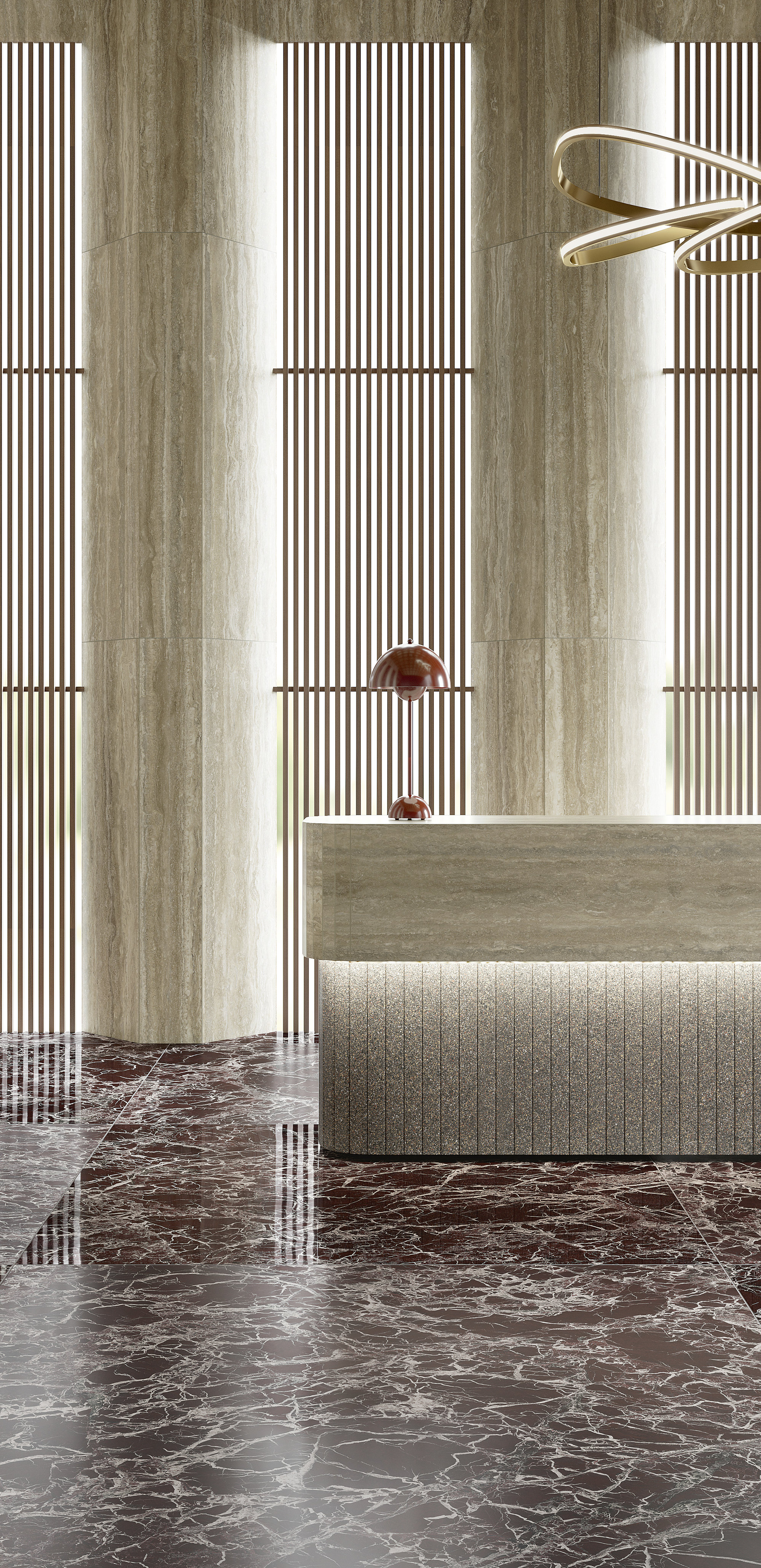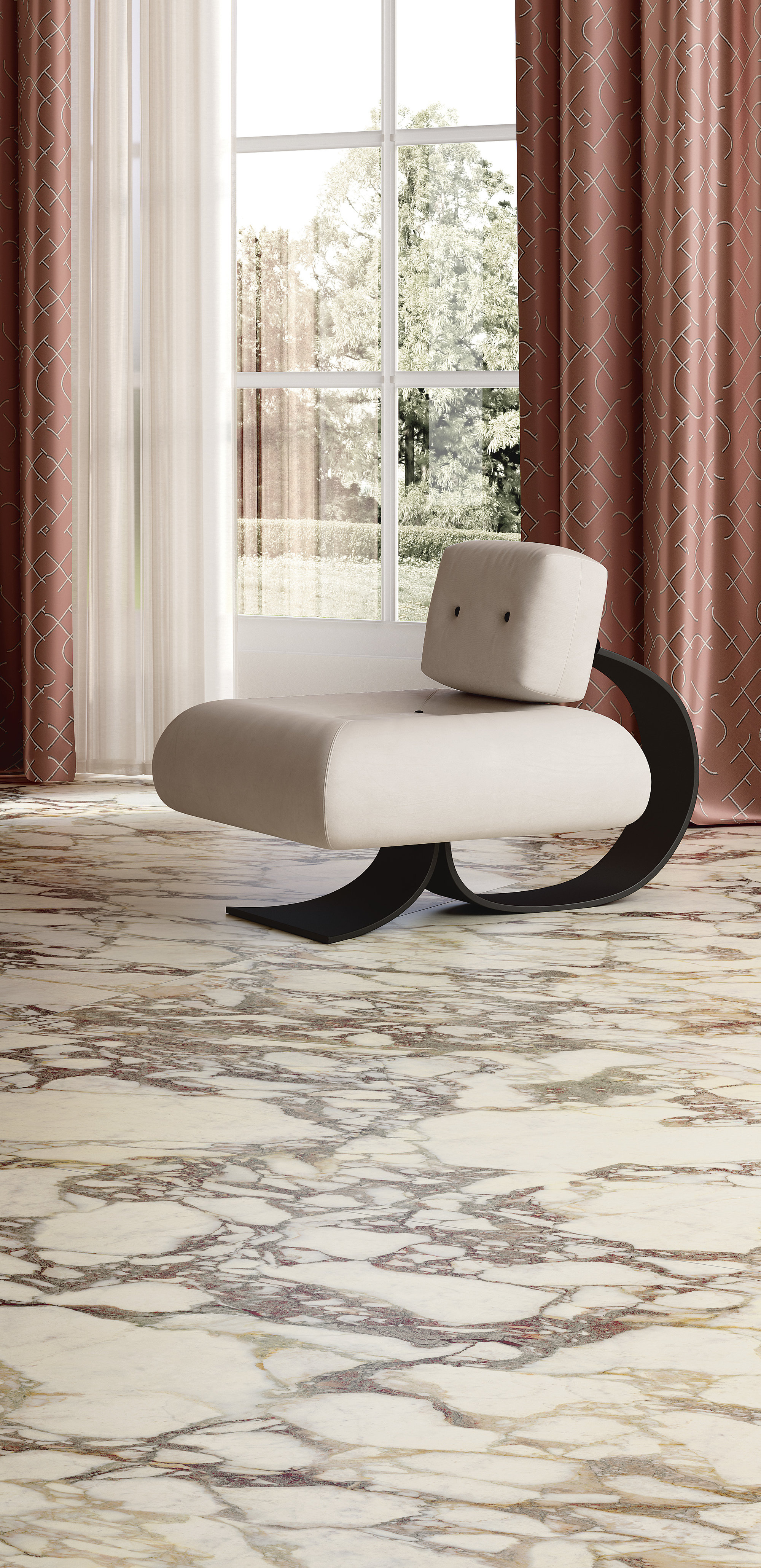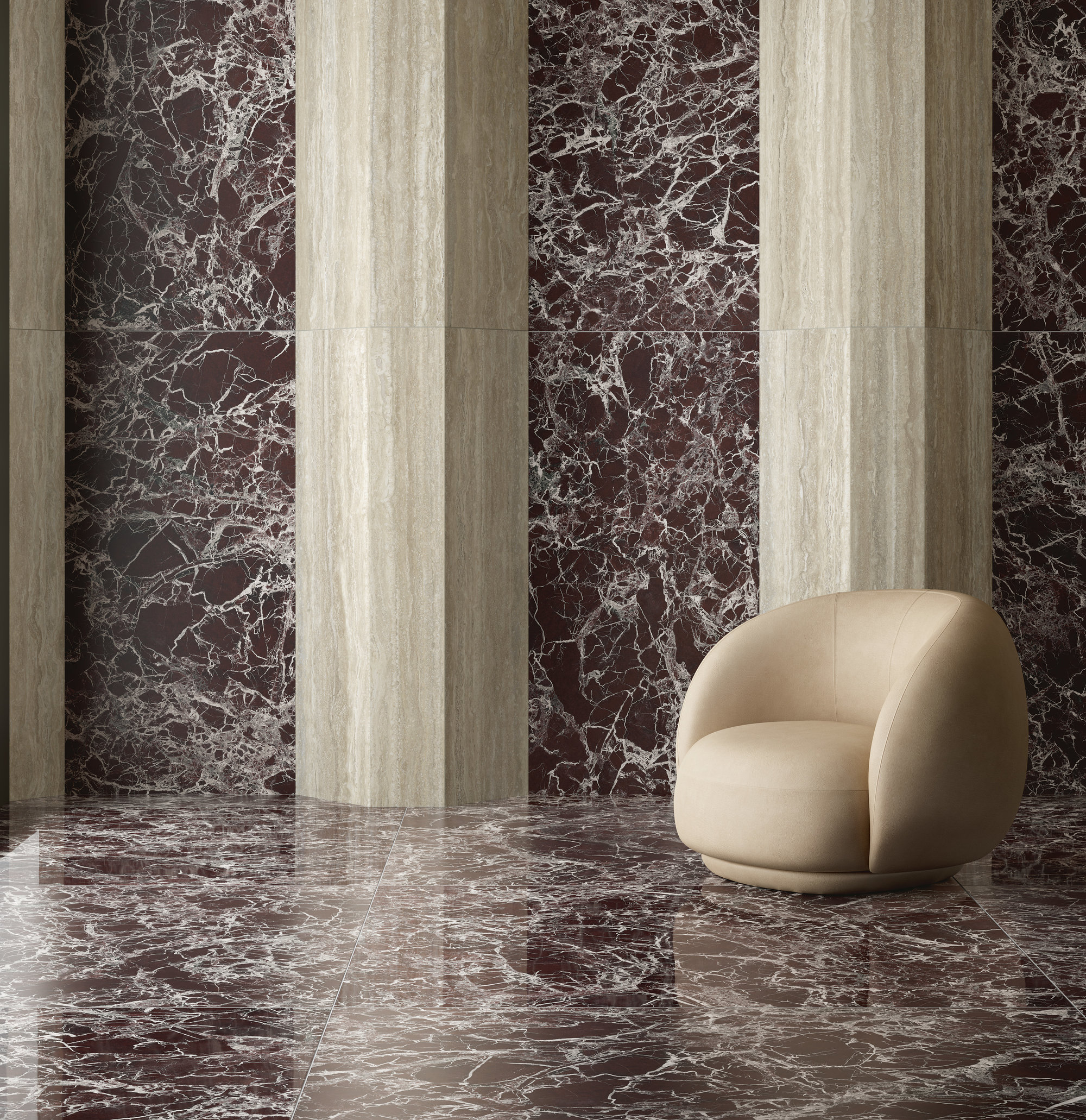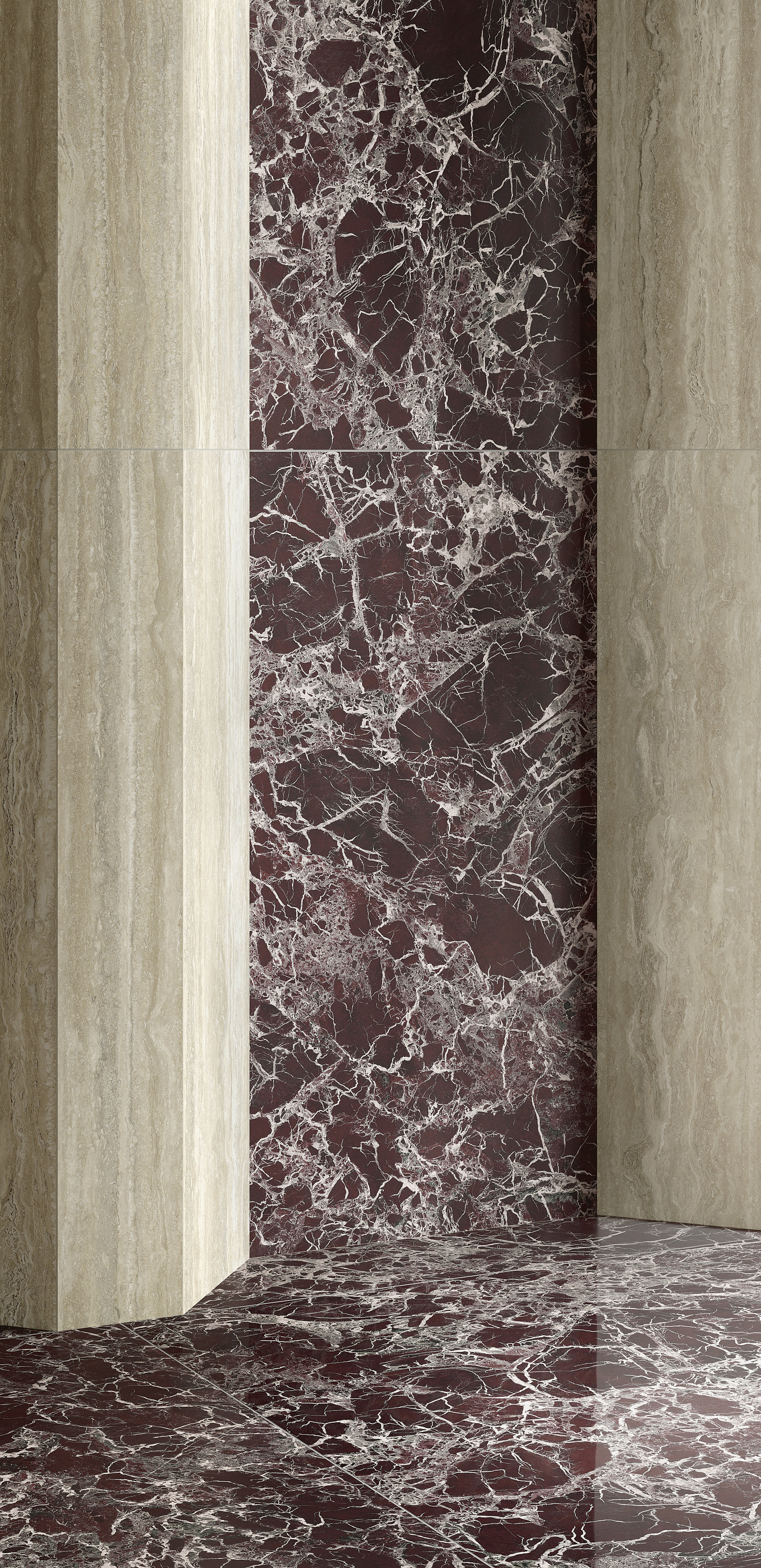 El dibujo brechiforme se vuelve majestuoso, imperial: extiende un tupidísimo entramado de vetas lechosas sobre el manto teñido de púrpura y burdeos, a veces interrumpido por intrusiones oscuras, más frías. La obra mineral, en su rigor e imprevisibilidad, hace gala de una identidad estética uniforme y, al mismo tiempo, infinitamente variable.