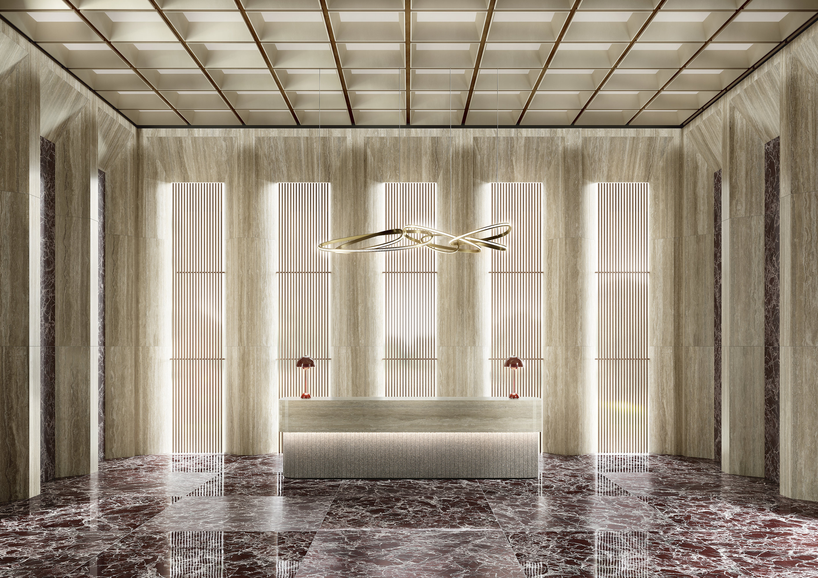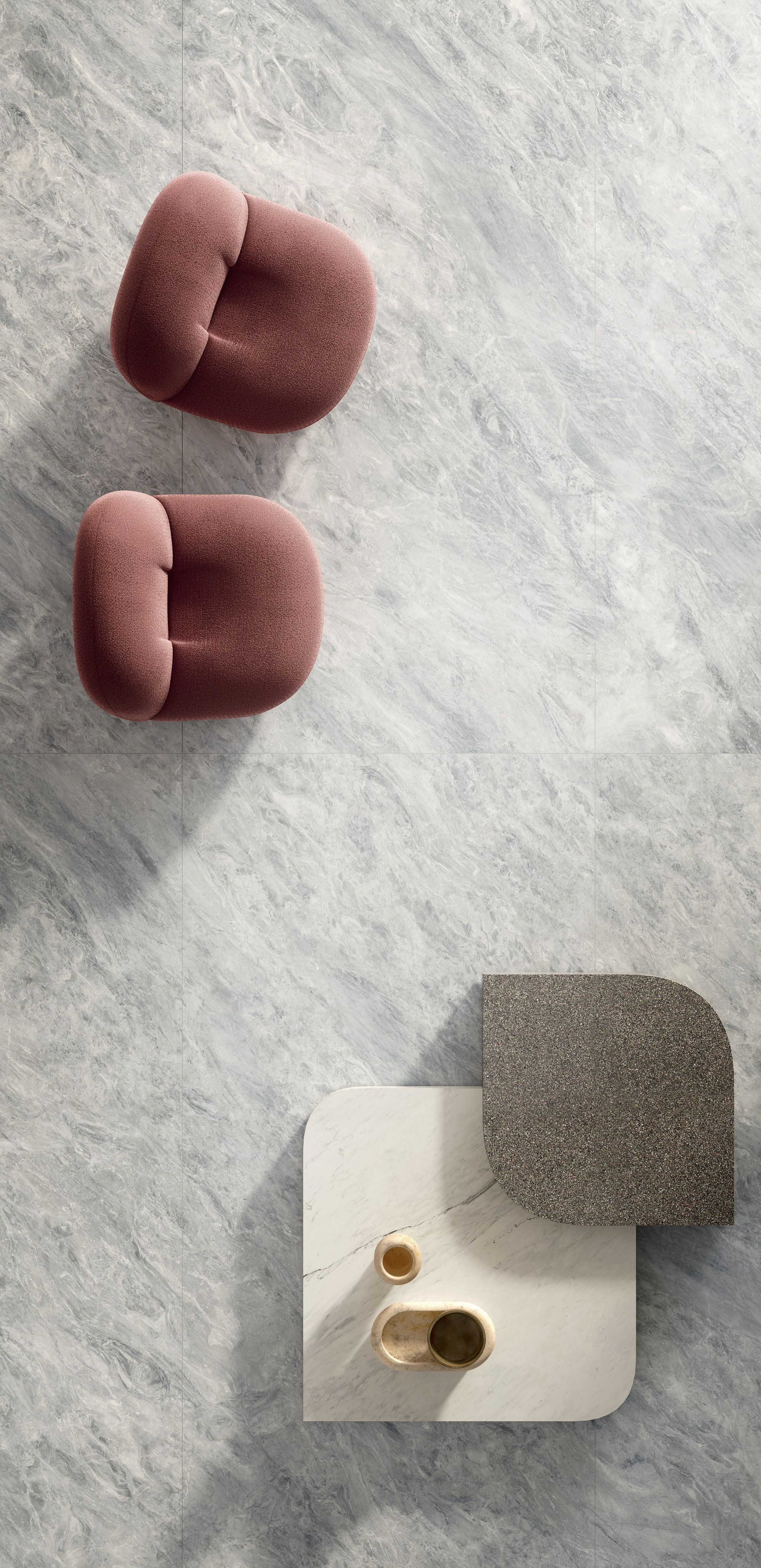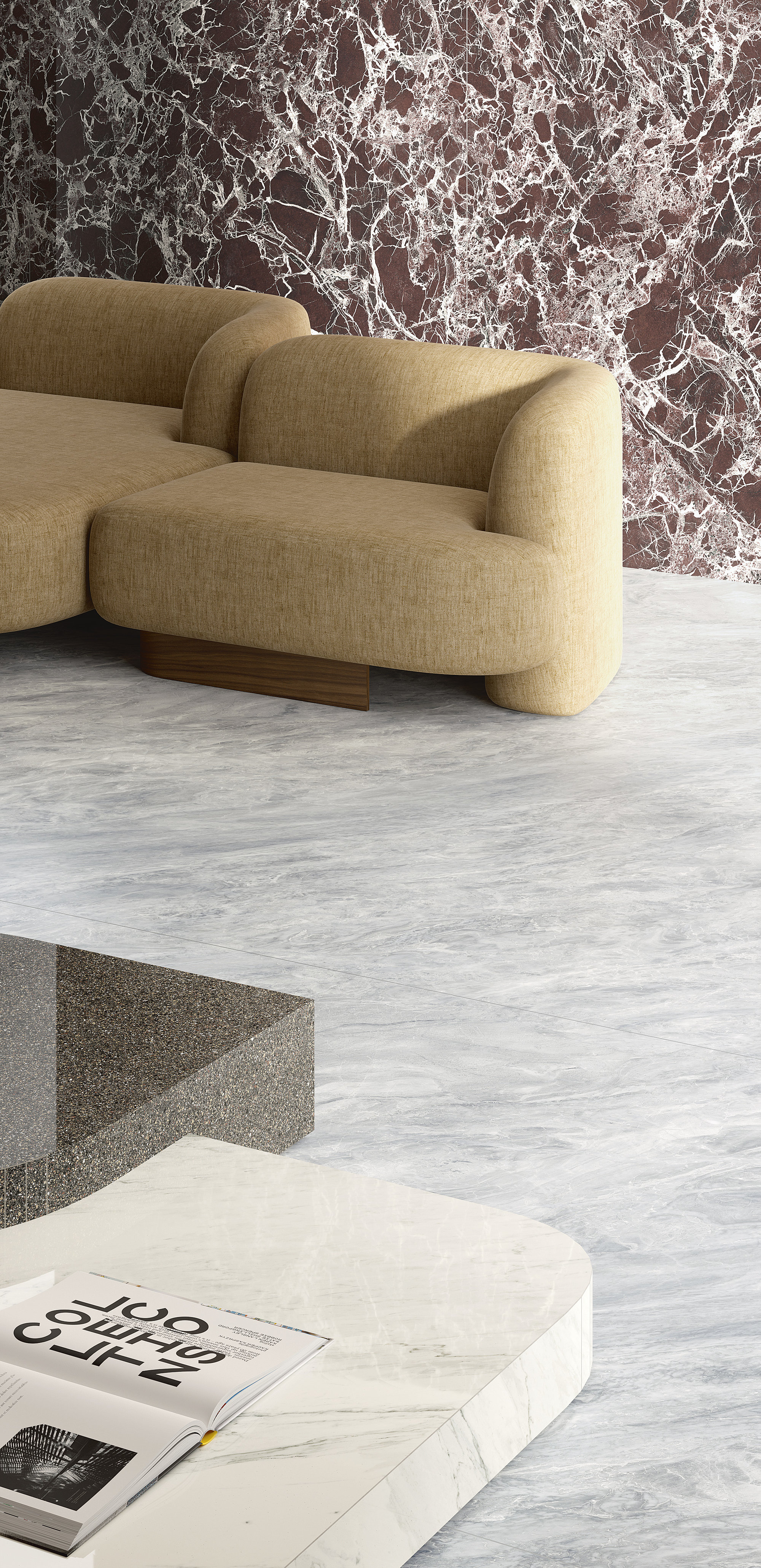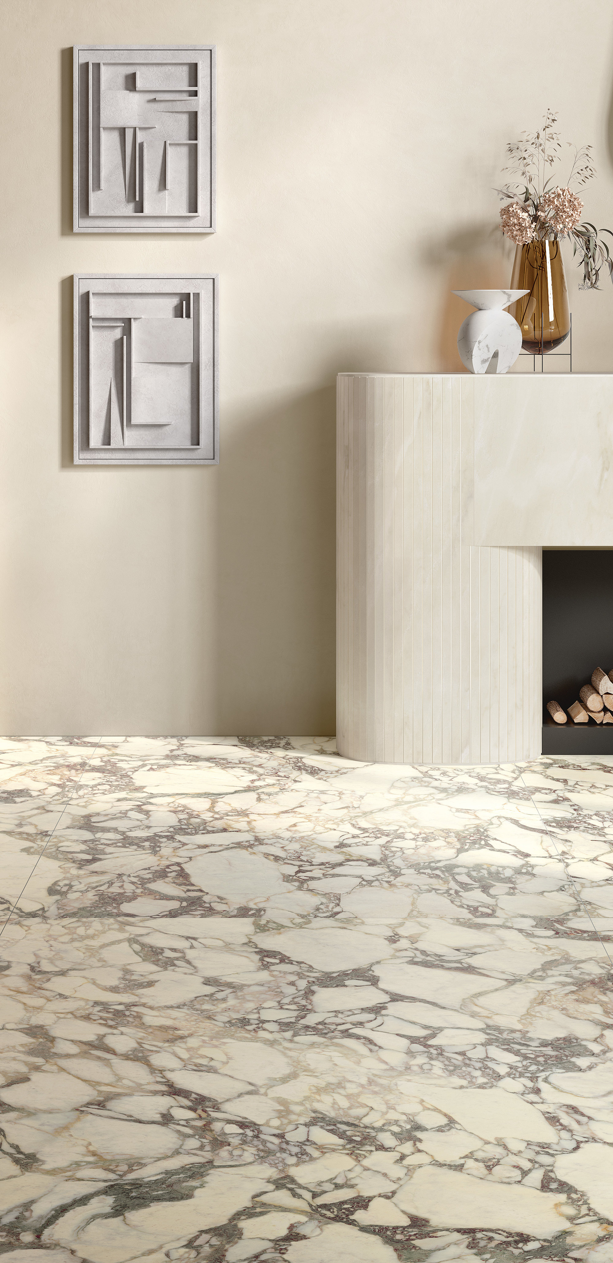 El dibujo brechiforme se vuelve majestuoso, imperial: extiende un tupidísimo entramado de vetas lechosas sobre el manto teñido de púrpura y burdeos, a veces interrumpido por intrusiones oscuras, más frías. La obra mineral, en su rigor e imprevisibilidad, hace gala de una identidad estética uniforme y, al mismo tiempo, infinitamente variable.