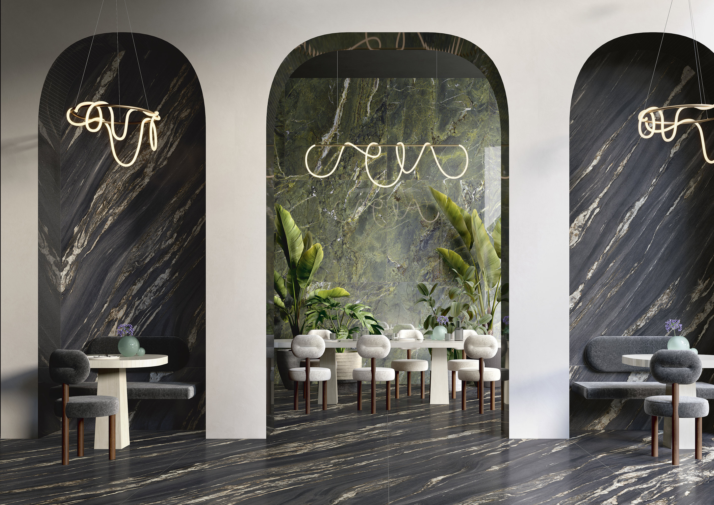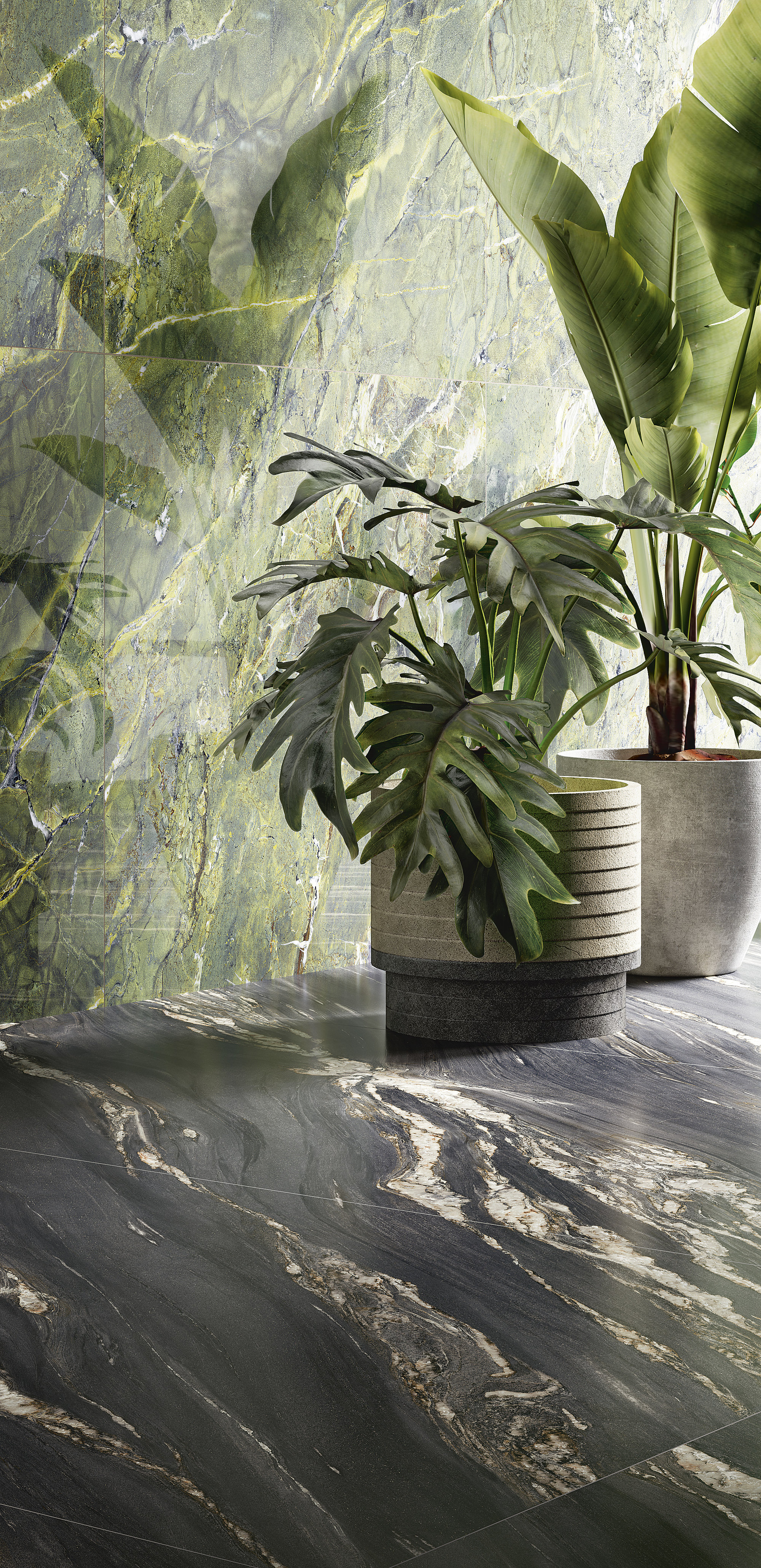 Como el telón de fondo de un teatro, el mármol pone en escena obras iluminadas por un poderoso ardor decorativo. En la superficie, se abren y se suceden arabescos minerales similares a llamas de color oro pardusco que, con un movimiento ondulado, caldean y realzan un manto mineral de un atractivo dramático y misterioso.