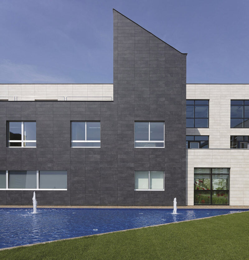 La envolvente arquitectónica de la bodega está diseñada como un elemento distintivo y sostenible, armonizando estética, funcionalidad y respeto por el medio ambiente. Las losas Active Surfaces® de Fiandre, instaladas sobre una fachada ventilada Granitech, cubren uniformemente los volúmenes principales, proporcionando al edificio una imagen contemporánea y refinada. La ventilación controlada mejora la gestión térmica, reduce la acumulación de calor y optimiza la eficiencia energética.