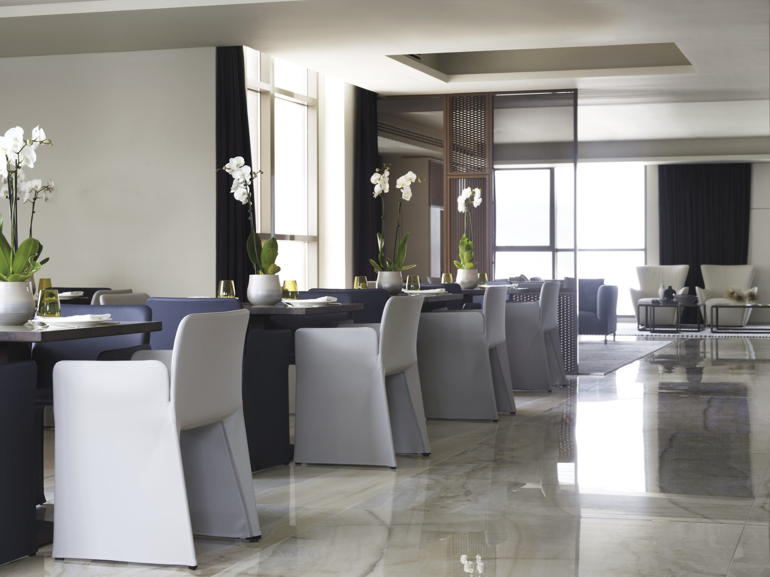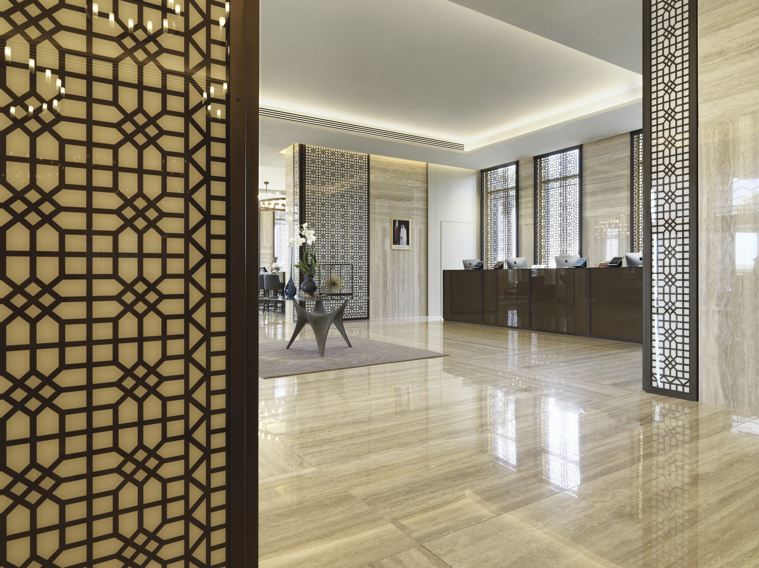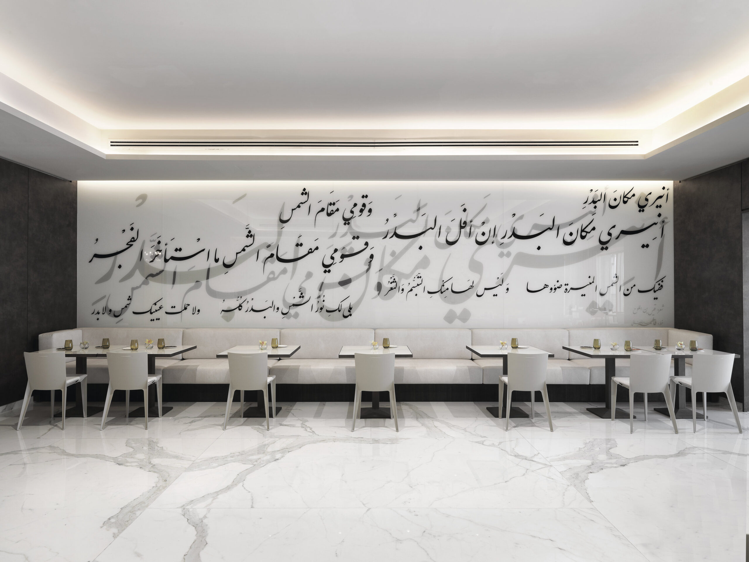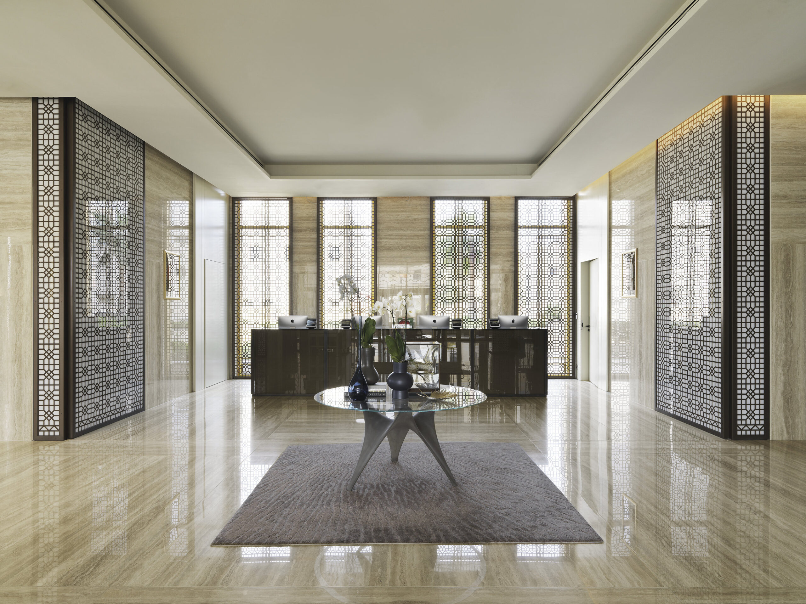 El concepto combina tradición de Oriente Medio y diseño contemporáneo, creando ambientes sofisticados y funcionales. Para este proyecto, Nunziati colaboró con marcas de excelencia, entre ellas Fiandre, que proporcionó superficies cerámicas de gran formato para las áreas más prestigiosas.
