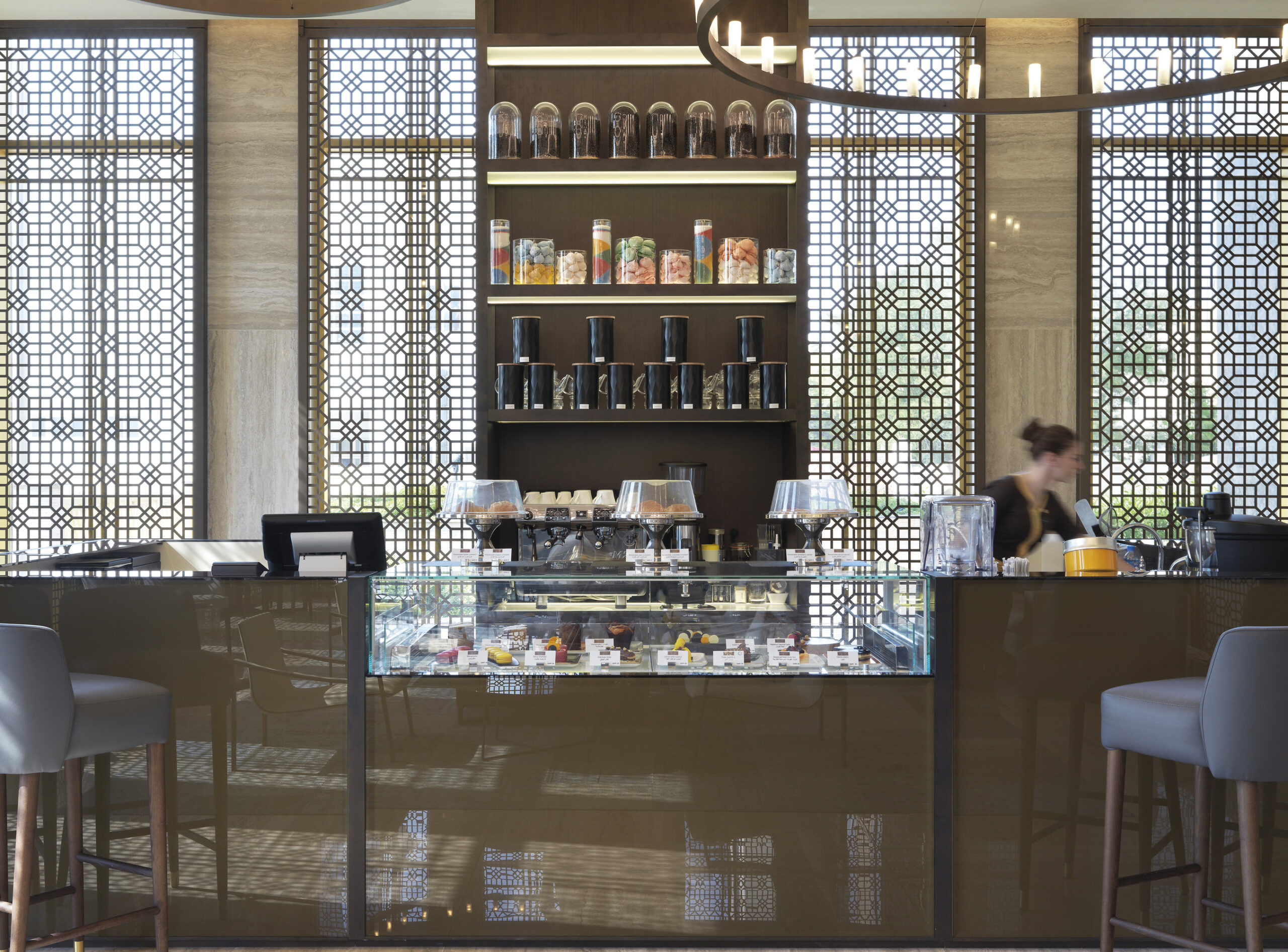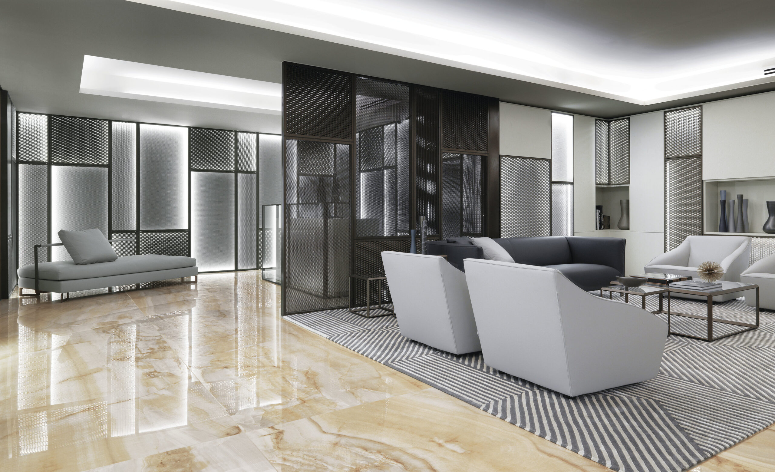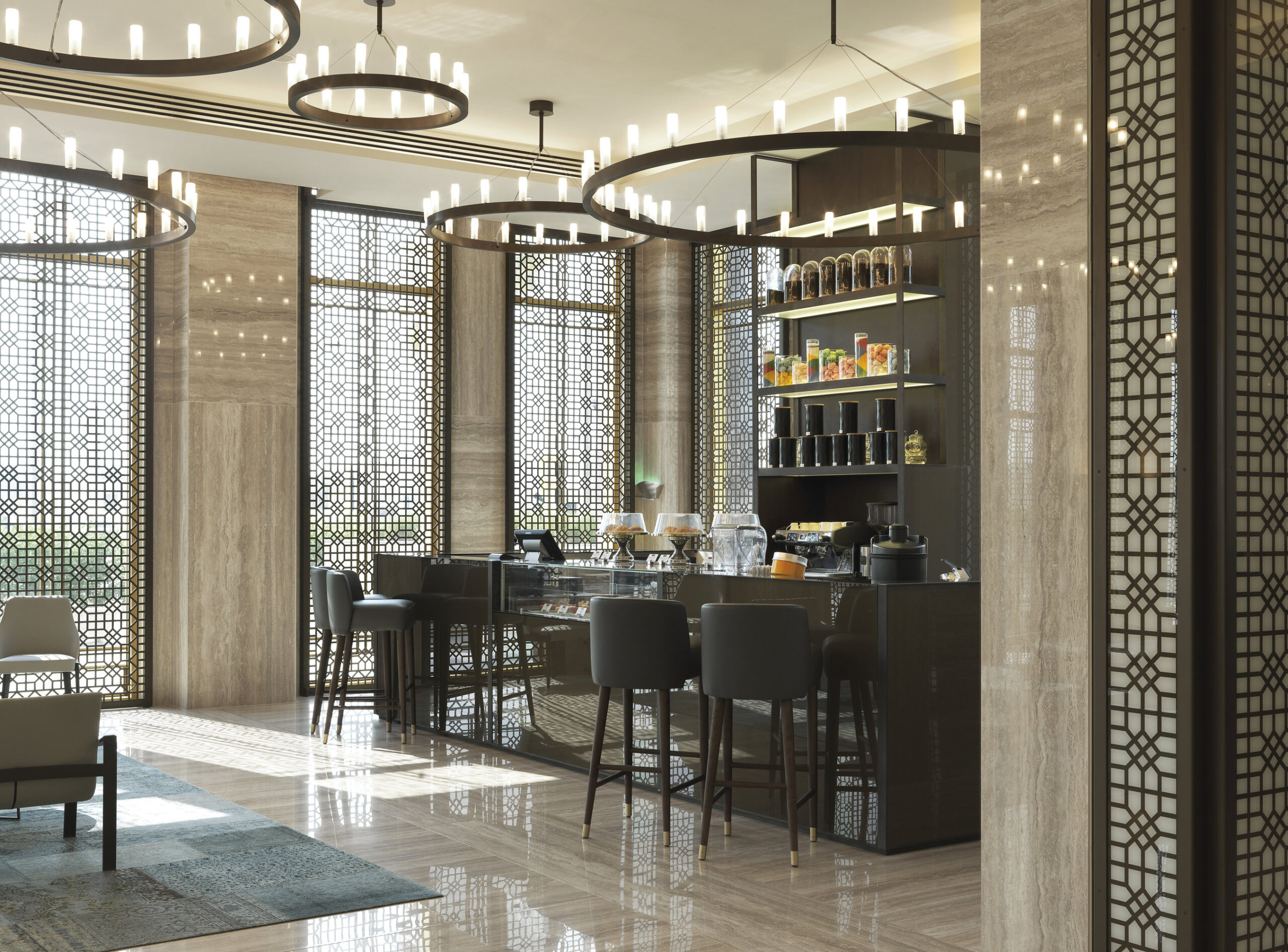 El concepto combina tradición de Oriente Medio y diseño contemporáneo, creando ambientes sofisticados y funcionales. Para este proyecto, Nunziati colaboró con marcas de excelencia, entre ellas Fiandre, que proporcionó superficies cerámicas de gran formato para las áreas más prestigiosas.