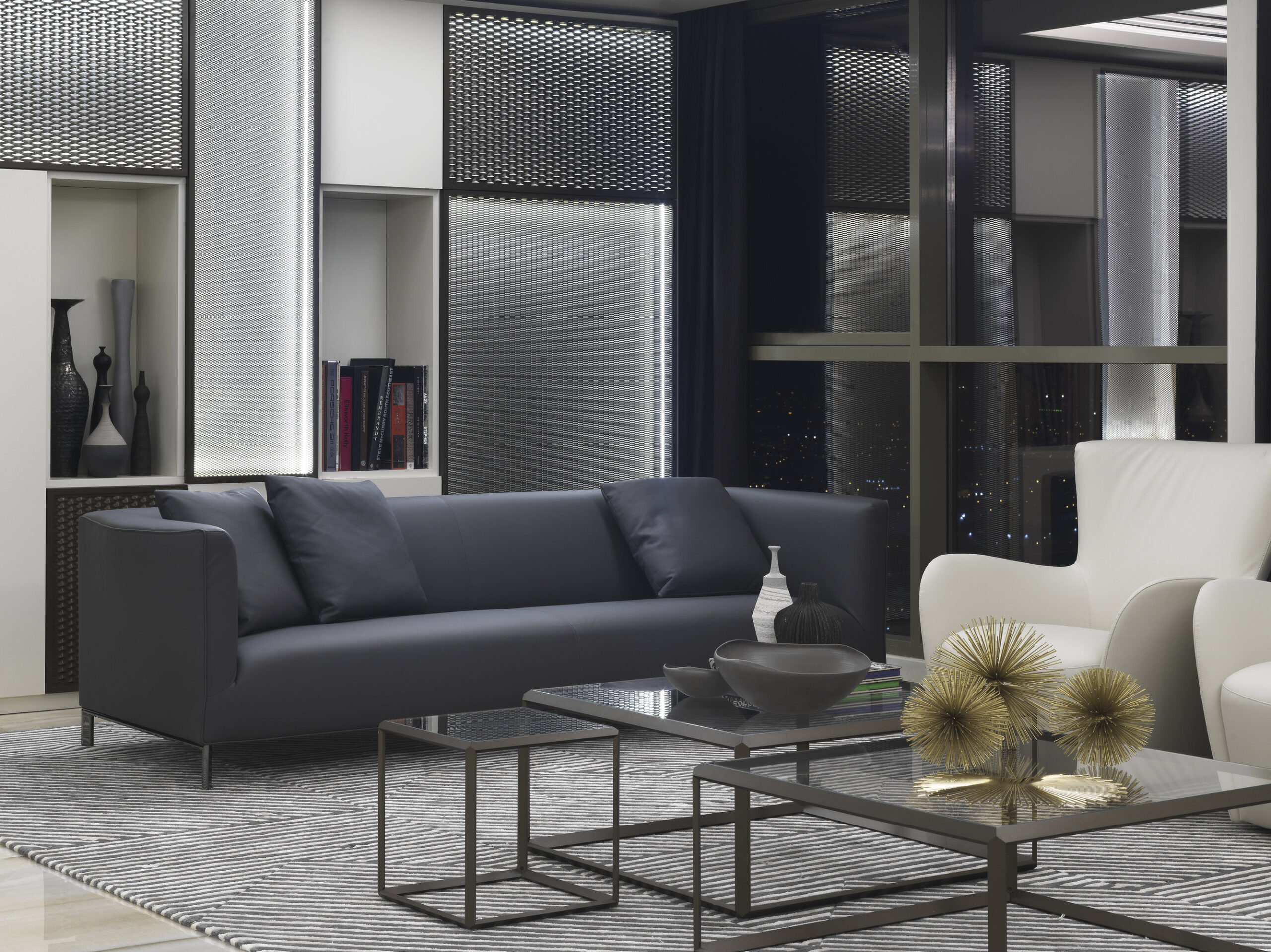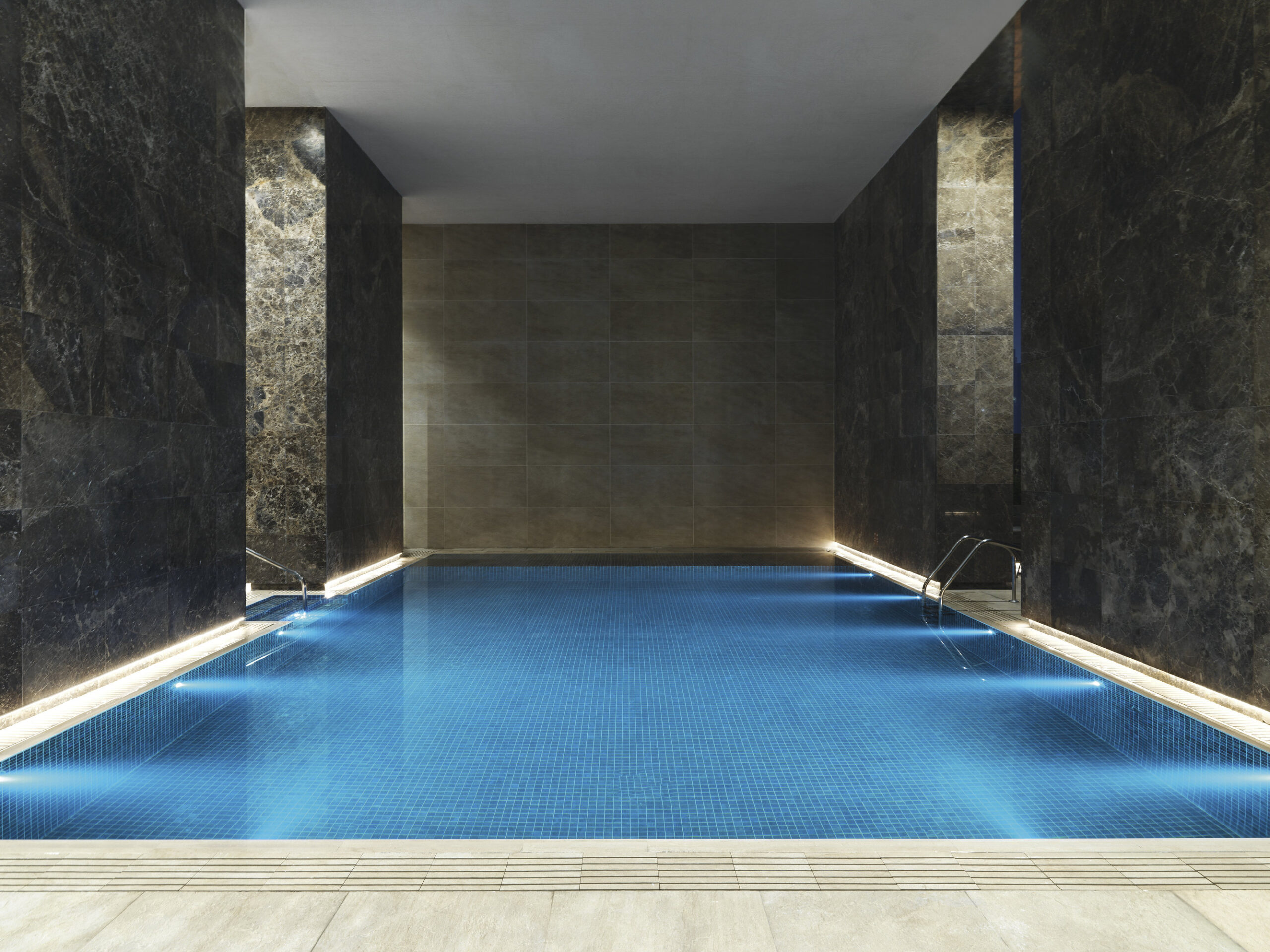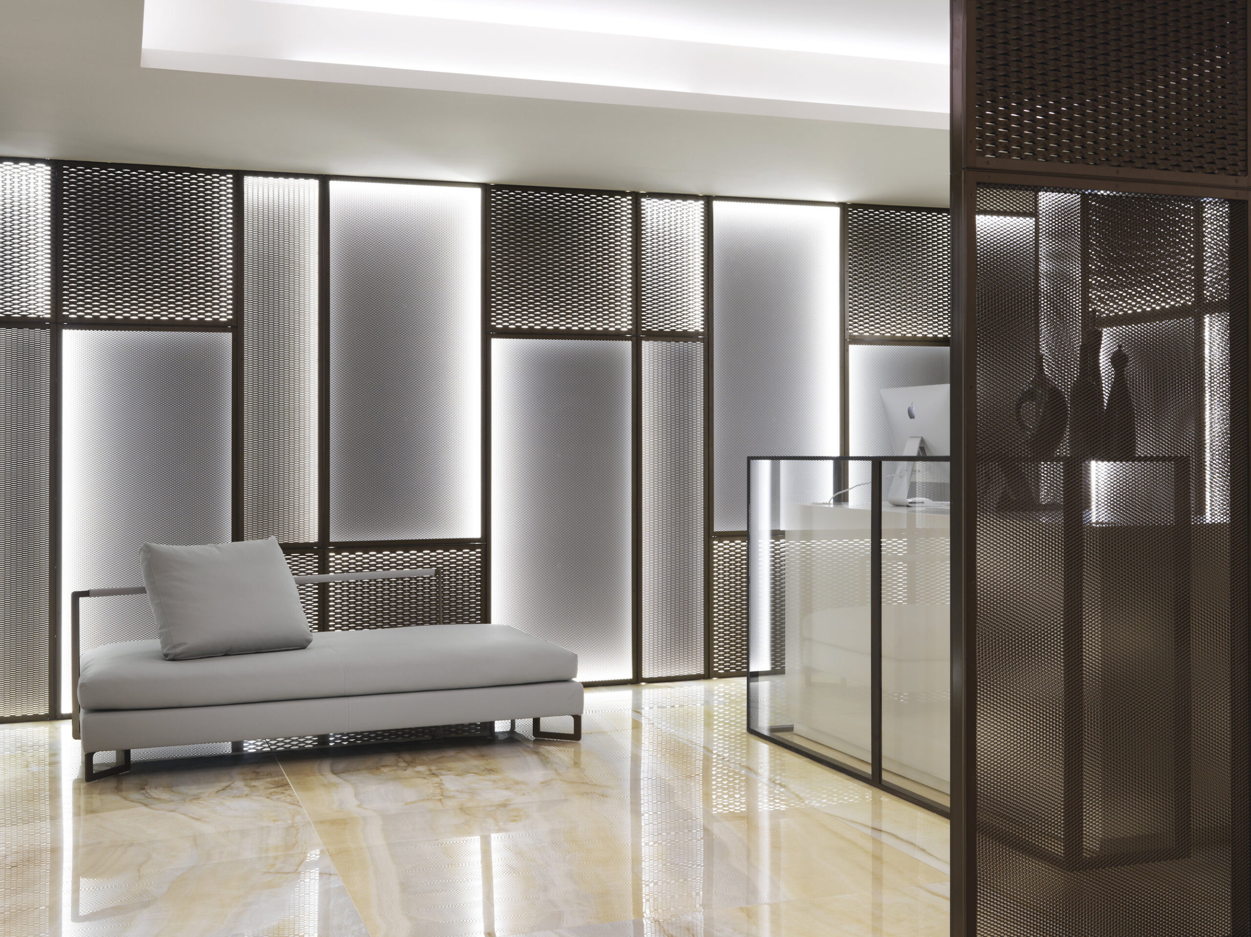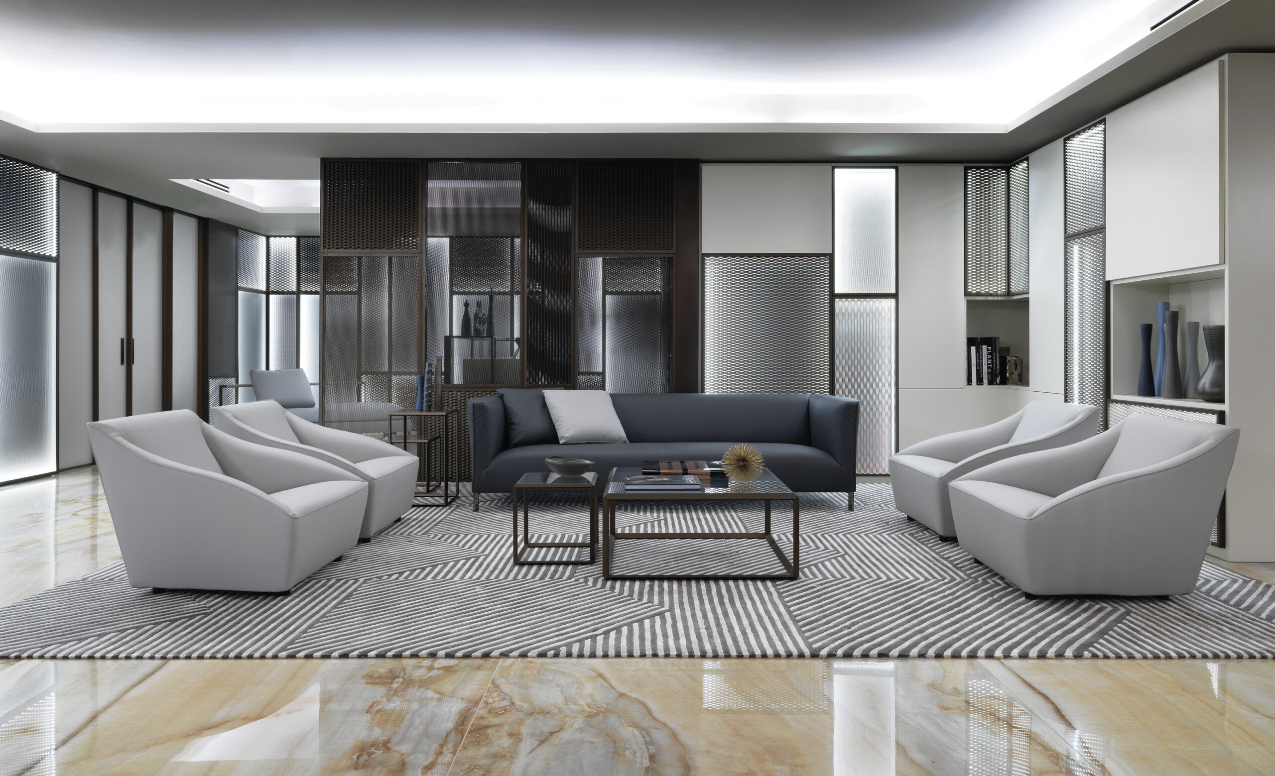 El concepto combina tradición de Oriente Medio y diseño contemporáneo, creando ambientes sofisticados y funcionales. Para este proyecto, Nunziati colaboró con marcas de excelencia, entre ellas Fiandre, que proporcionó superficies cerámicas de gran formato para las áreas más prestigiosas.