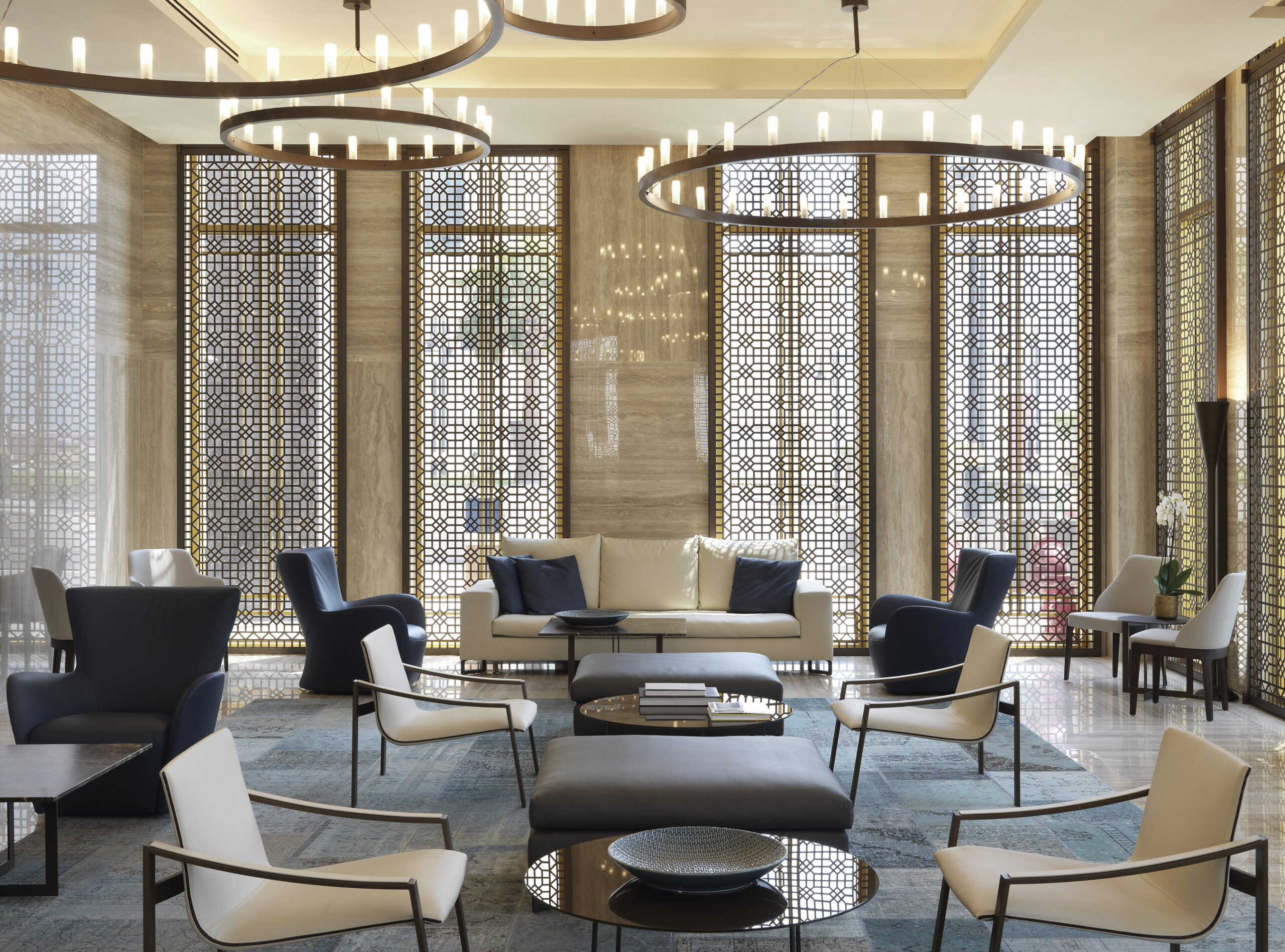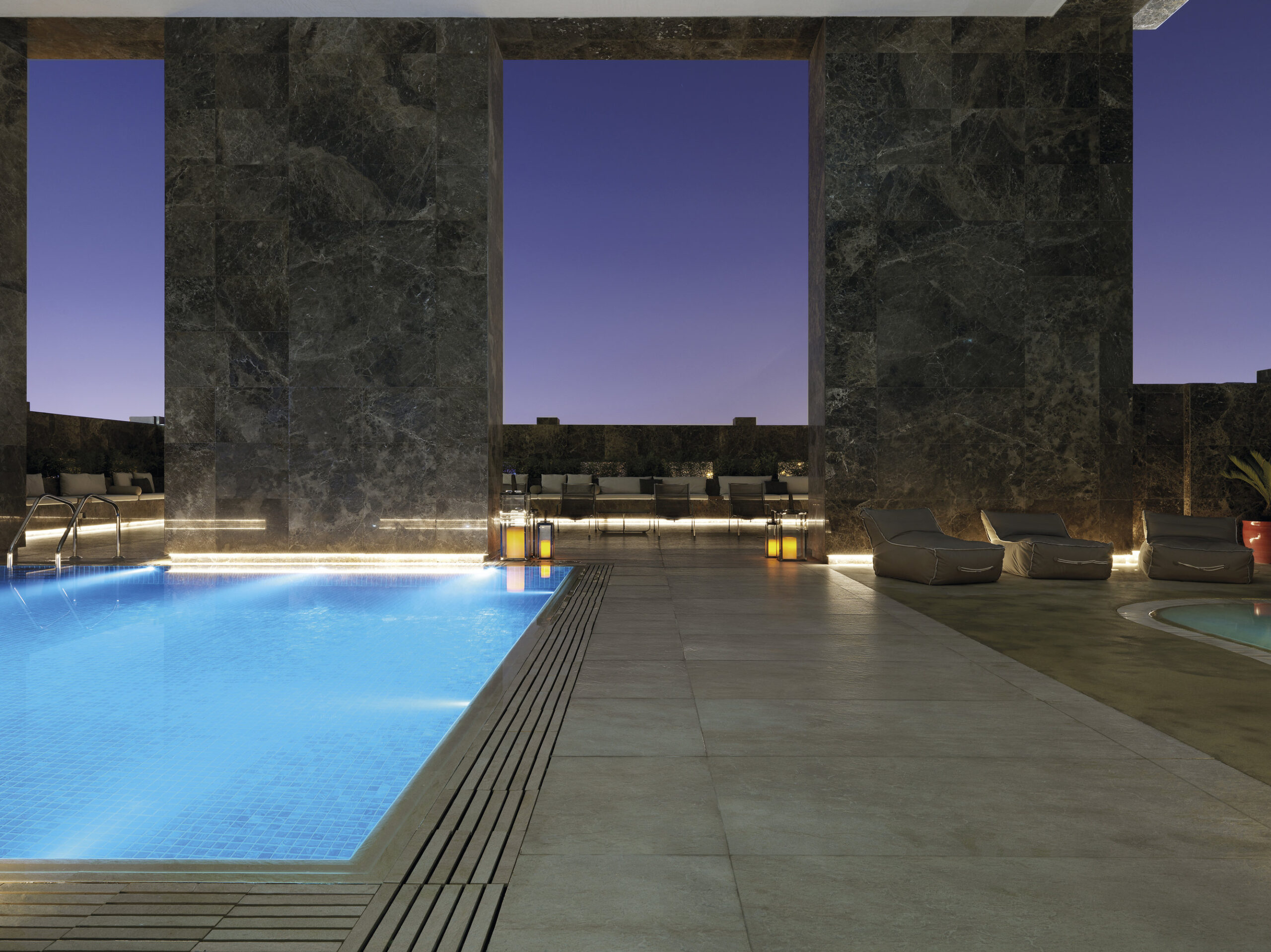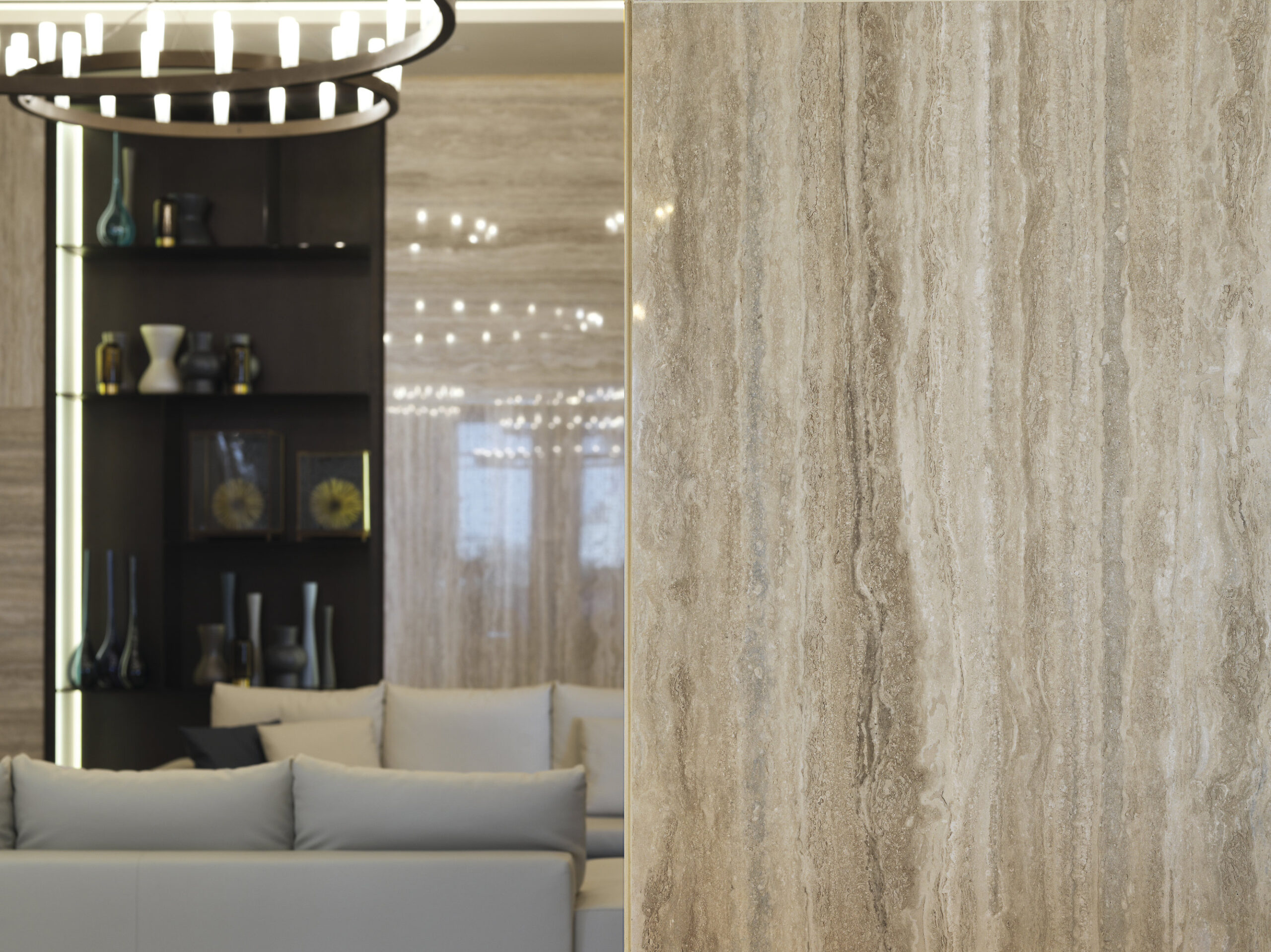 Las losas Marmi Maximum (300×150 cm, espesor 6 mm) en gres porcelánico revisten el vestíbulo, los restaurantes y las salas lounge. Travertino Maximum aporta al vestíbulo tonos cálidos inspirados en la arena del desierto, Calacatta Maximum realza la luminosidad de los restaurantes, mientras que Gold Onyx Maximum añade exclusividad a la lounge del piso 32. El gran formato reduce las juntas, amplía los espacios y garantiza continuidad visual.