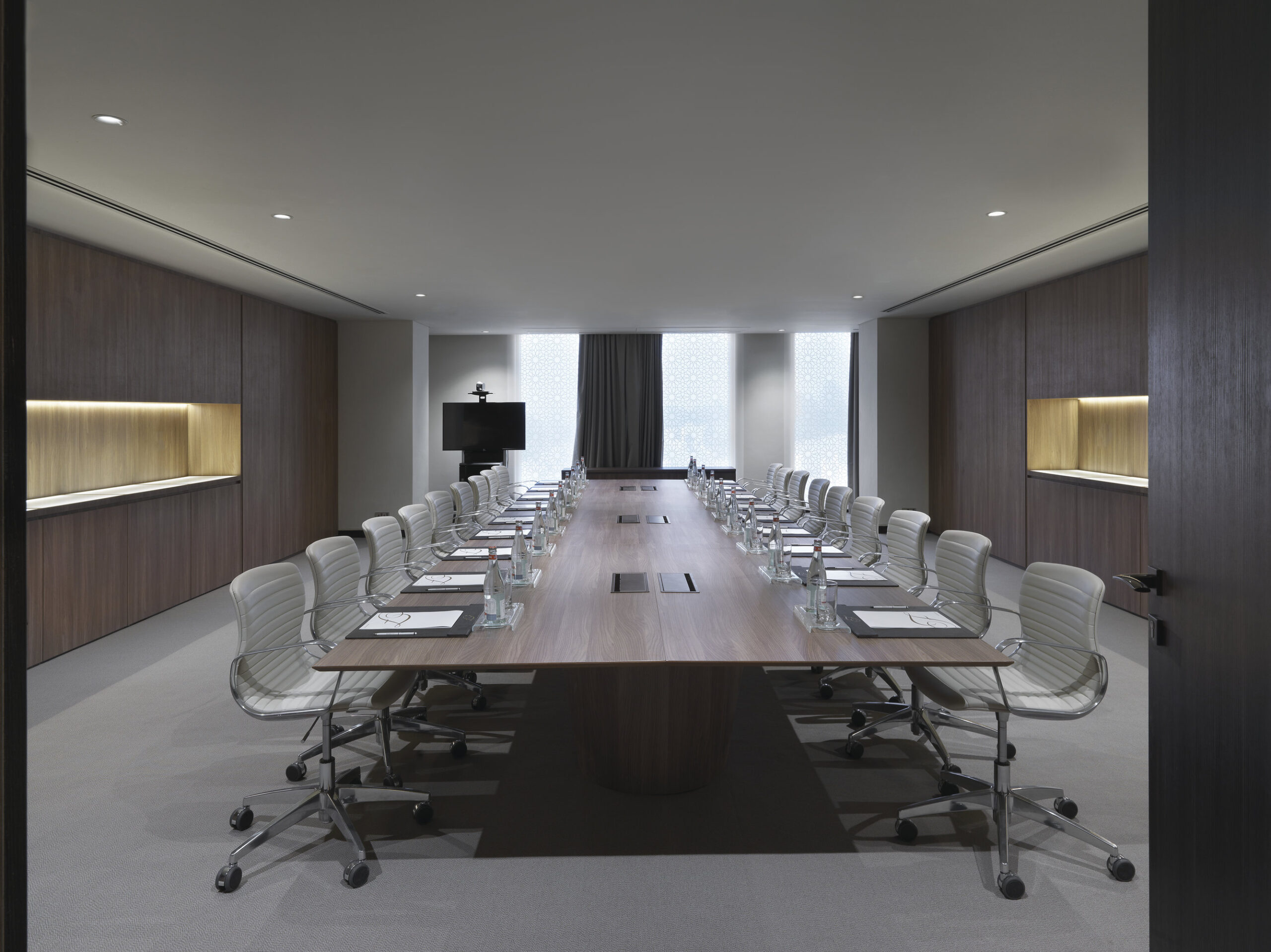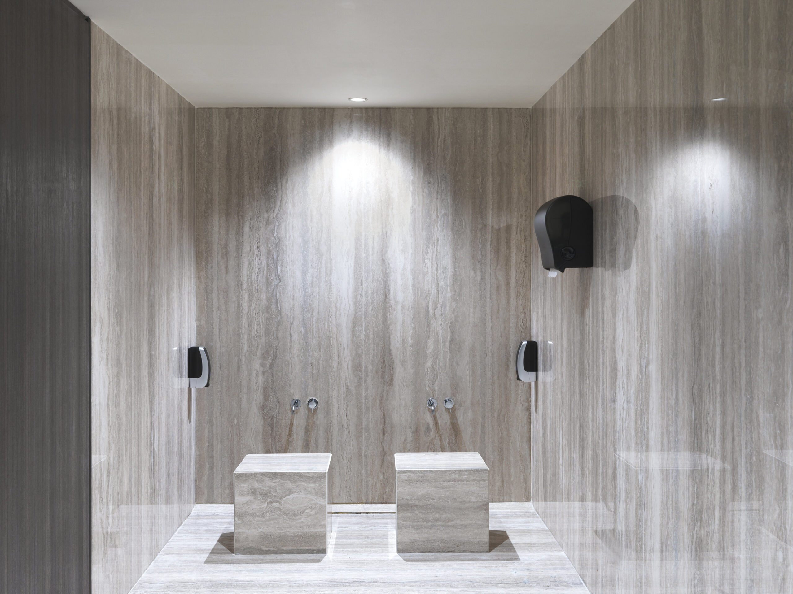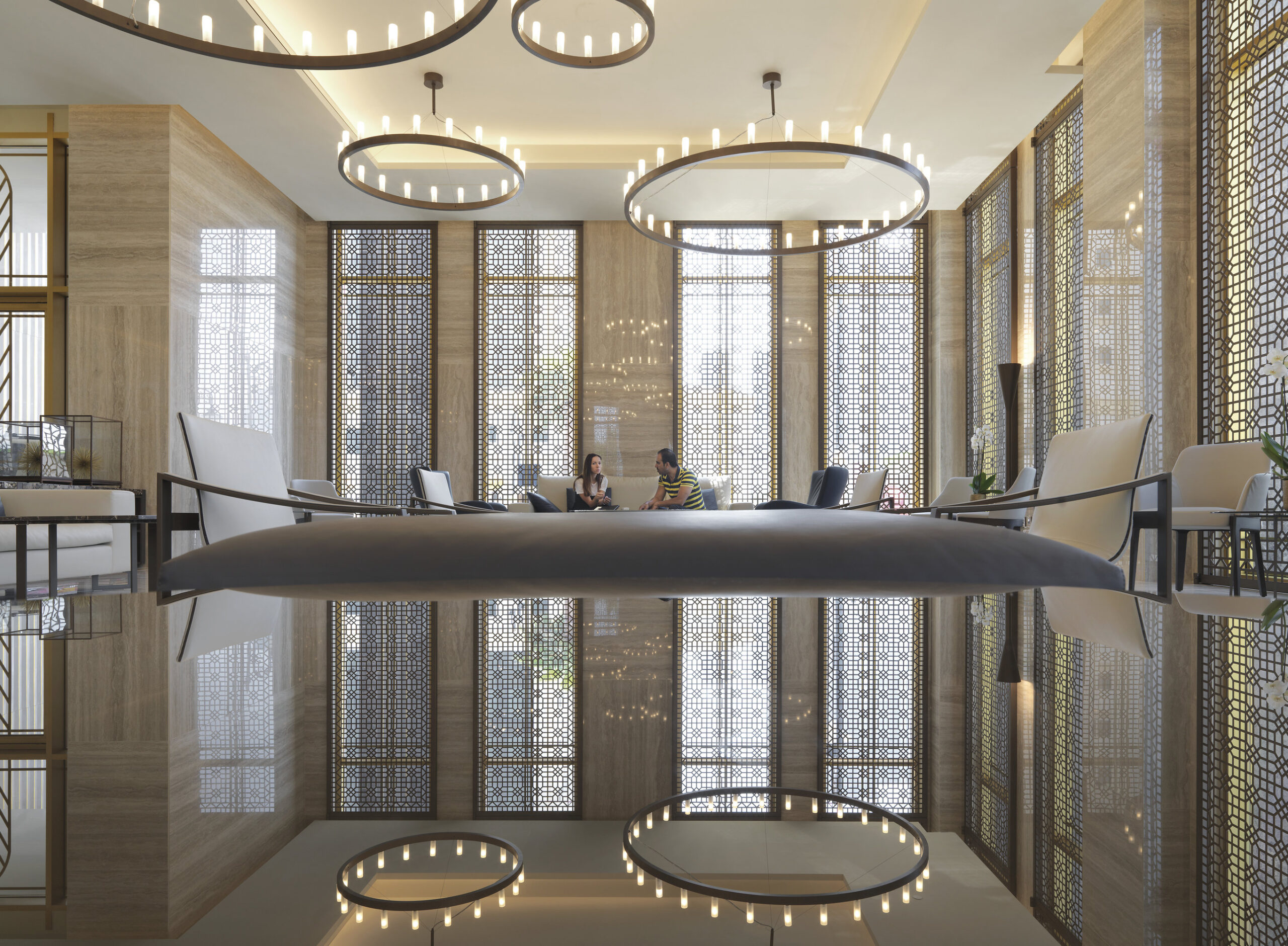 Las losas Marmi Maximum (300×150 cm, espesor 6 mm) en gres porcelánico revisten el vestíbulo, los restaurantes y las salas lounge. Travertino Maximum aporta al vestíbulo tonos cálidos inspirados en la arena del desierto, Calacatta Maximum realza la luminosidad de los restaurantes, mientras que Gold Onyx Maximum añade exclusividad a la lounge del piso 32. El gran formato reduce las juntas, amplía los espacios y garantiza continuidad visual.