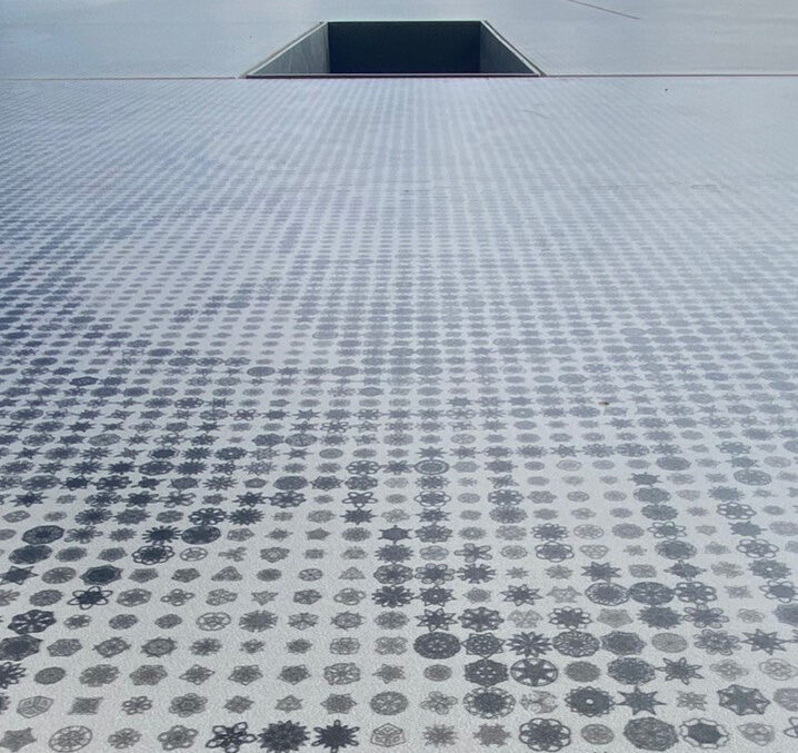 El suelo del patio, realizado con las superficies Fjord de Fiandre, conduce a los visitantes más allá de una piscina reflectante situada bajo un óculo, también revestido con las mismas losas cerámicas fijadas al intradós, que enmarca una vista de la cúpula de la iglesia. Durante los cálidos meses de verano, la brisa atraviesa el patio sombreado y, al pasar por la piscina, refresca a los visitantes que ingresan al complejo verde que rodea la iglesia.